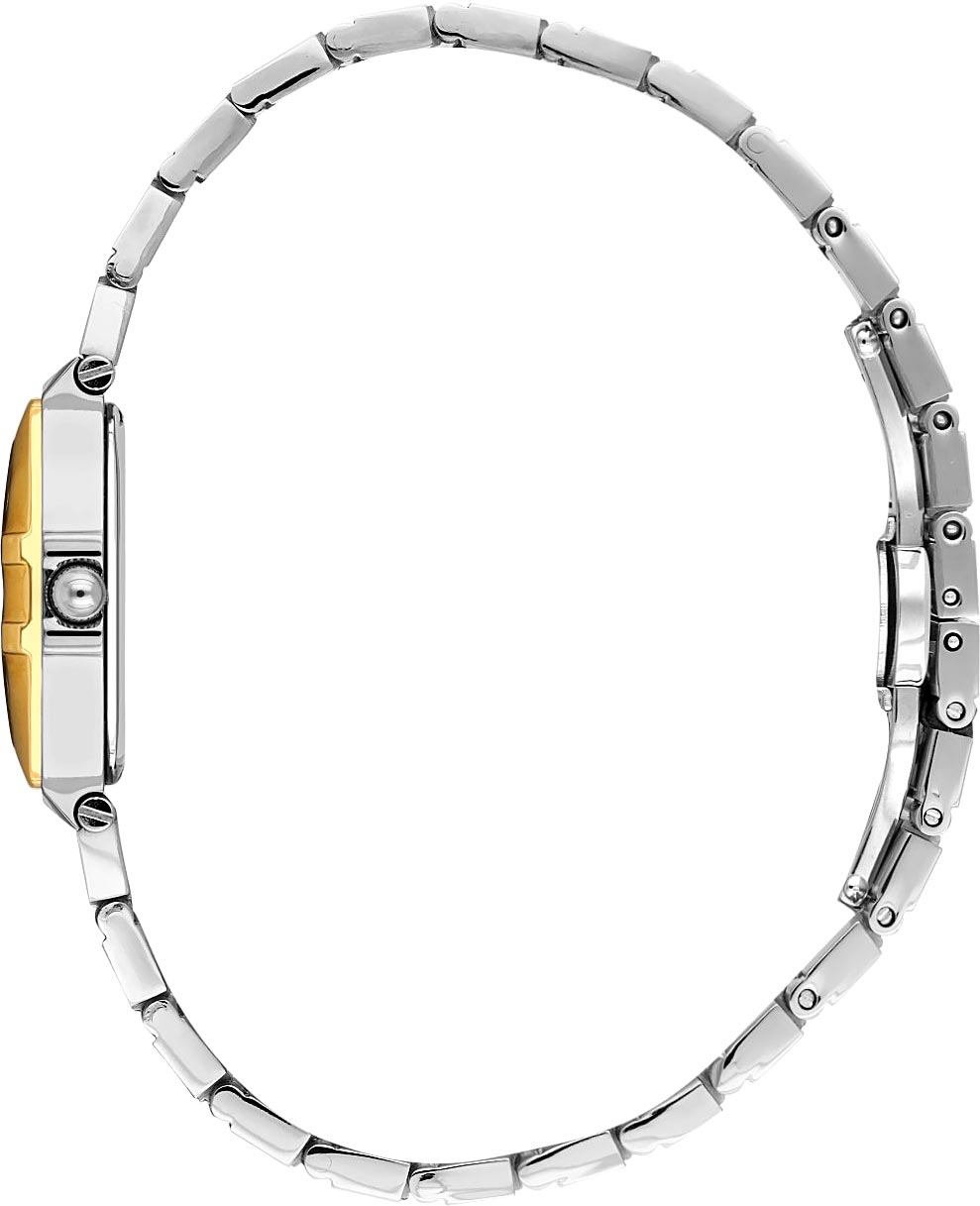 Наручные женские часы в прямоугольном стальном корпусе с накладным декоративным безелем. Циферблат выполнен по технологии Sunray (солнечные лучи) и украшен фирменным логотипом. Накладные метки в виде римских цифр и точек, украшенных кристаллами.