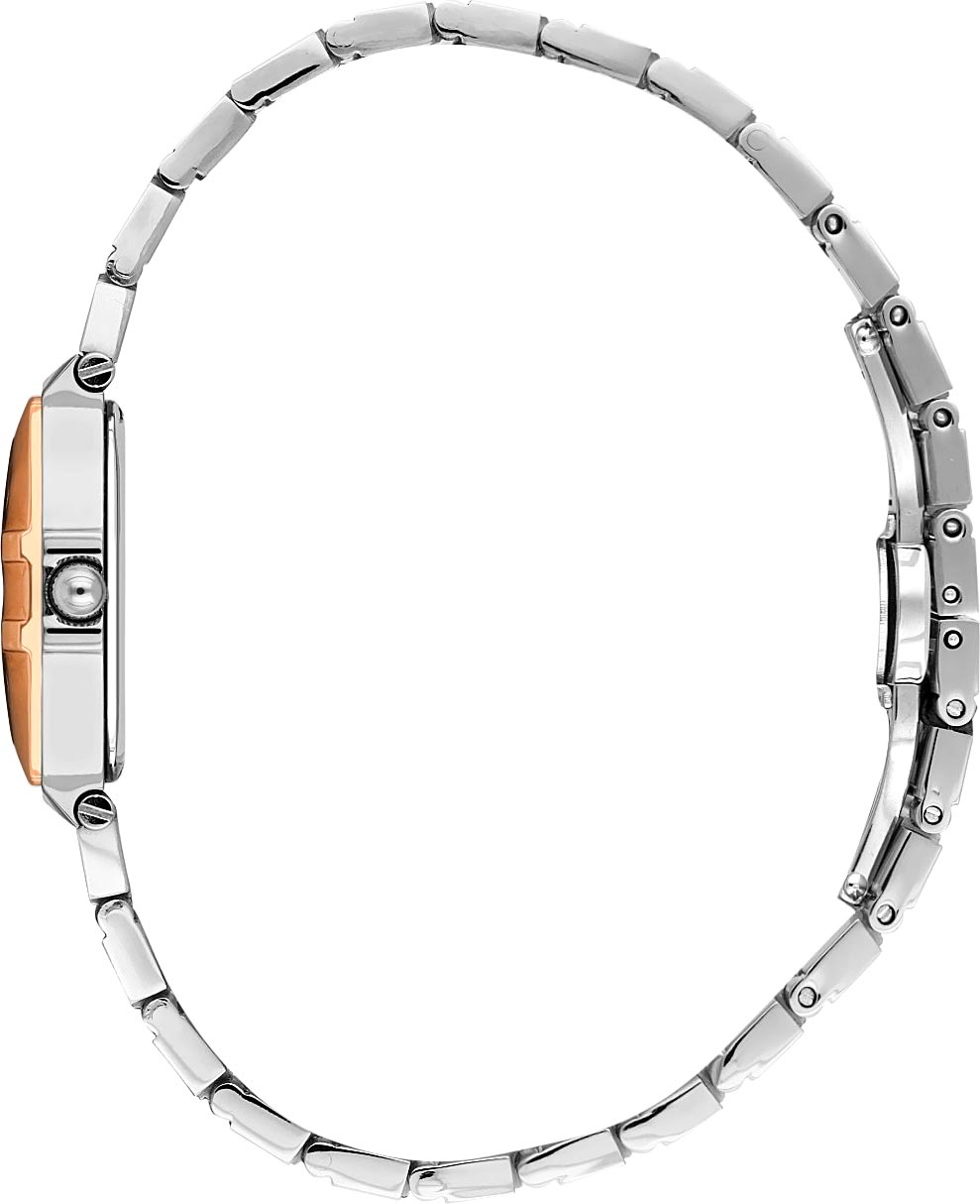 Наручные женские часы в прямоугольном стальном корпусе с накладным декоративным безелем. Циферблат выполнен по технологии Sunray (солнечные лучи) и украшен фирменным логотипом. Накладные метки в виде римских цифр и точек, украшенных кристаллами.