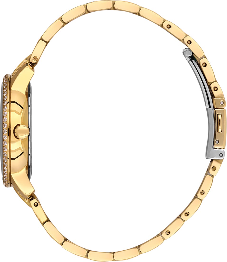 Кварцевые наручные женские часы. Круглый стальной корпус с полированной отделкой. Гильошированный циферблат украшен фирменным логотипом. Накладные метки в виде римской цифры XII и точек с кристаллами.