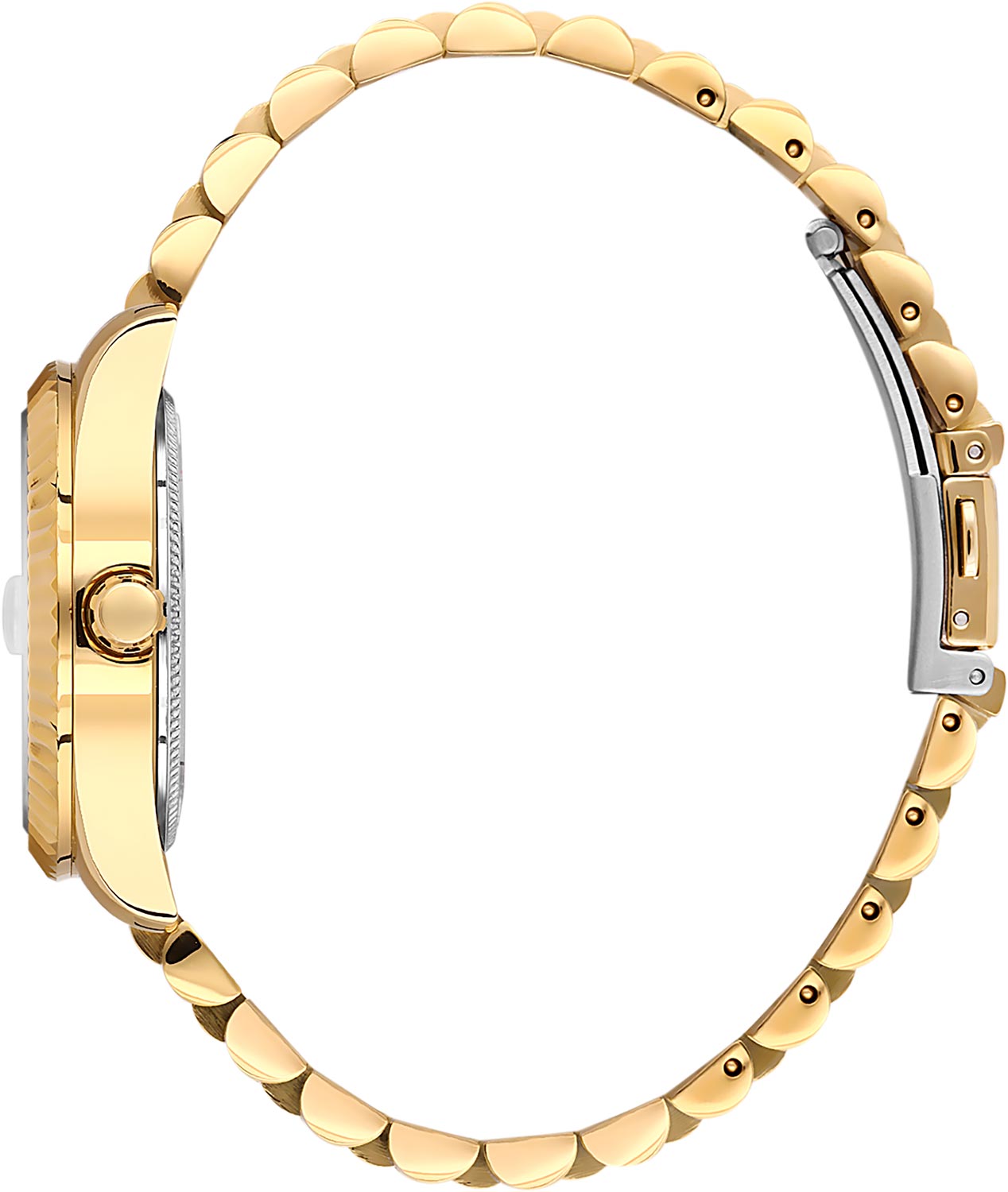 Женские часы с надежным японским механизмом. Циферблат украшен фирменным логотипом. Метки в виде точек, украшенных кристаллами. Окошко даты с увеличительным стеклом. Прямоугольные стрелки в стиле Baton с люминесцентным покрытием, которое светится в темноте после непродолжительной зарядки на свету. Рифленая заводная головка. Надежный стальной браслет с раскладывающейся застежкой.