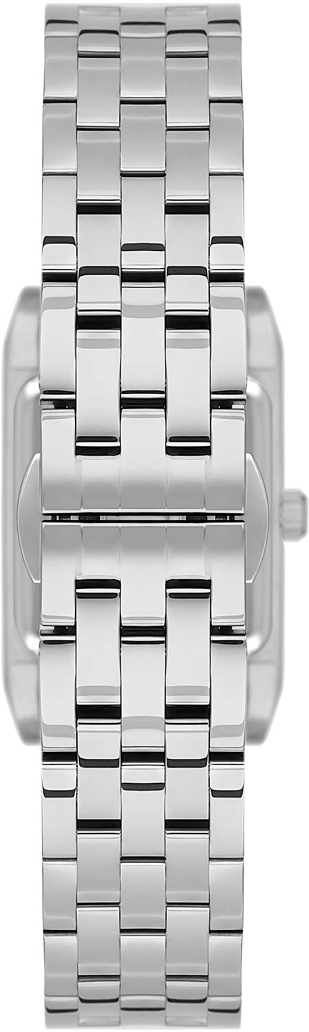 Изящные наручные женские часы. Прямоугольный стальной корпус украшен двумя рядами кристаллов. Циферблат выполнен по технологии Sunray (солнечные лучи) и украшен фирменным логотипом. Накладные метки в виде штрихов и римских цифр. Прямоугольные стрелки. Рифленая заводная головка. Надежный стальной браслет с полированной отделкой. Раскладывающаяся застежка.