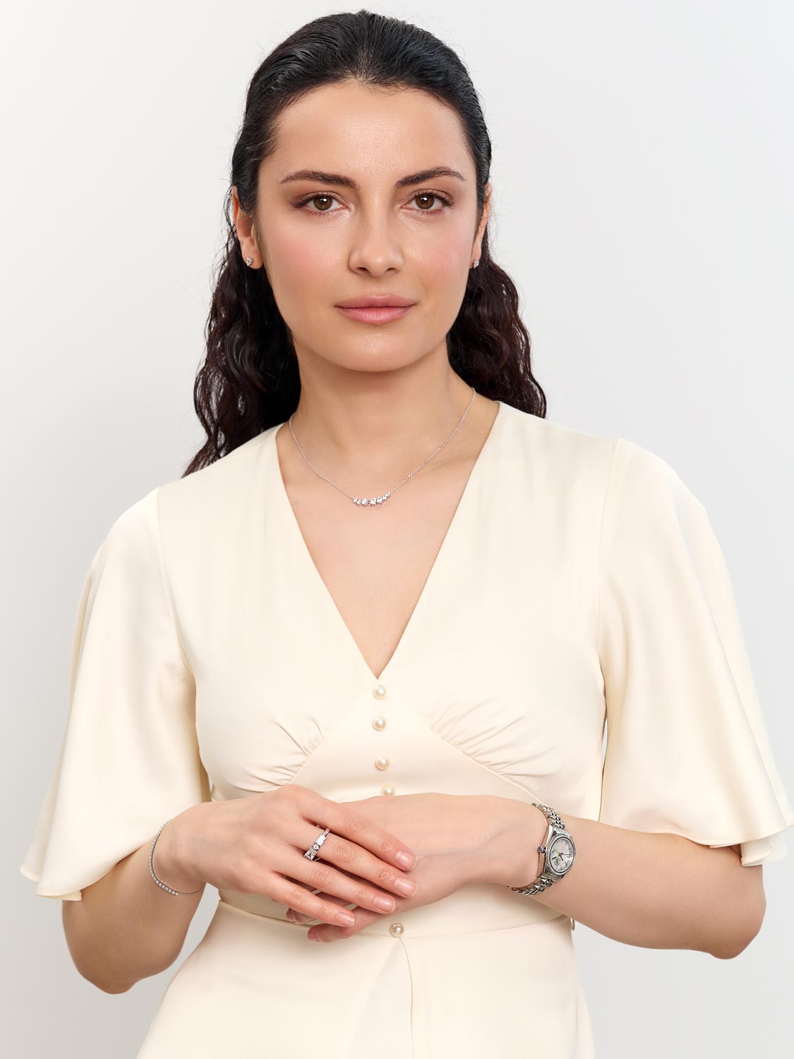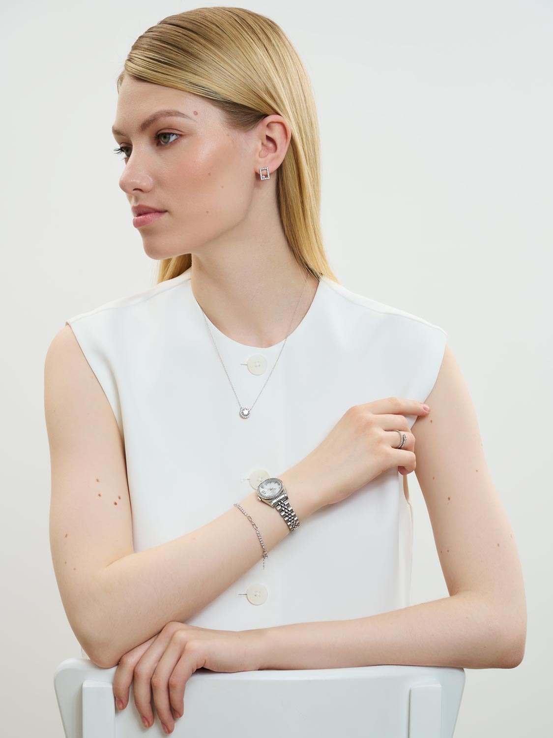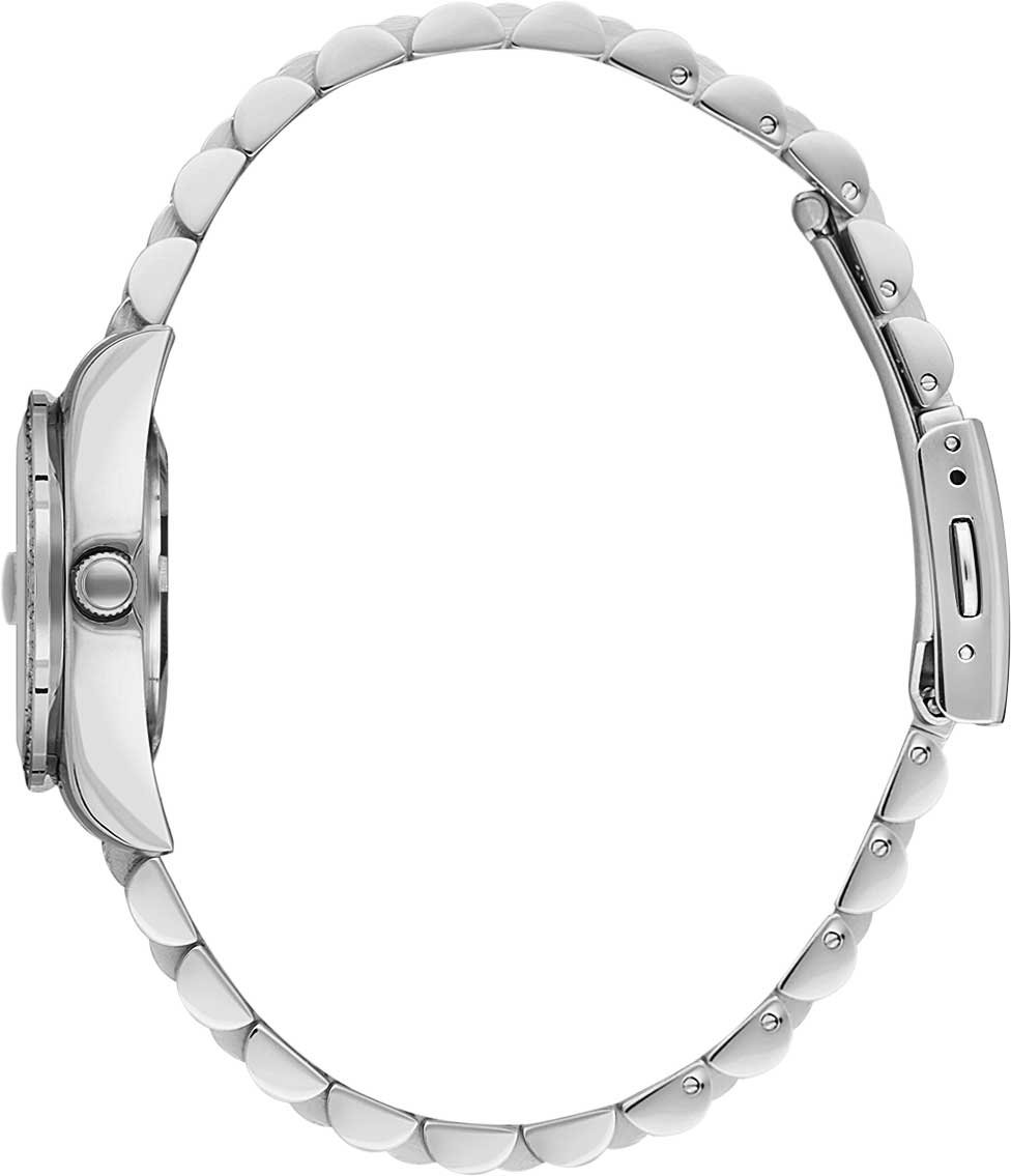 Unique. Женские часы с круглым стальным корпусом. Перламутровый циферблат защищен минеральным стеклом. Метки в виде точек инкрустированы кристаллами. Окошко даты с увеличительным стеклом находится в положении 3 часа. Рифленая заводная головка. Надежный стальной браслет с раскладывающейся застежкой.