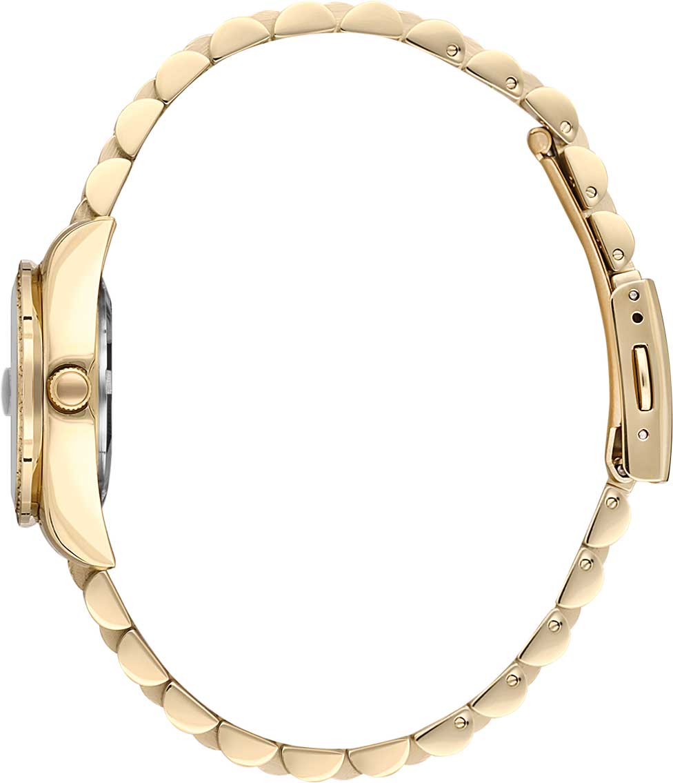 Unique. Женские часы с круглым стальным корпусом. Перламутровый циферблат защищен минеральным стеклом. Метки в виде точек инкрустированы кристаллами. Окошко даты с увеличительным стеклом находится в положении 3 часа. Рифленая заводная головка. Надежный стальной браслет с раскладывающейся застежкой.
