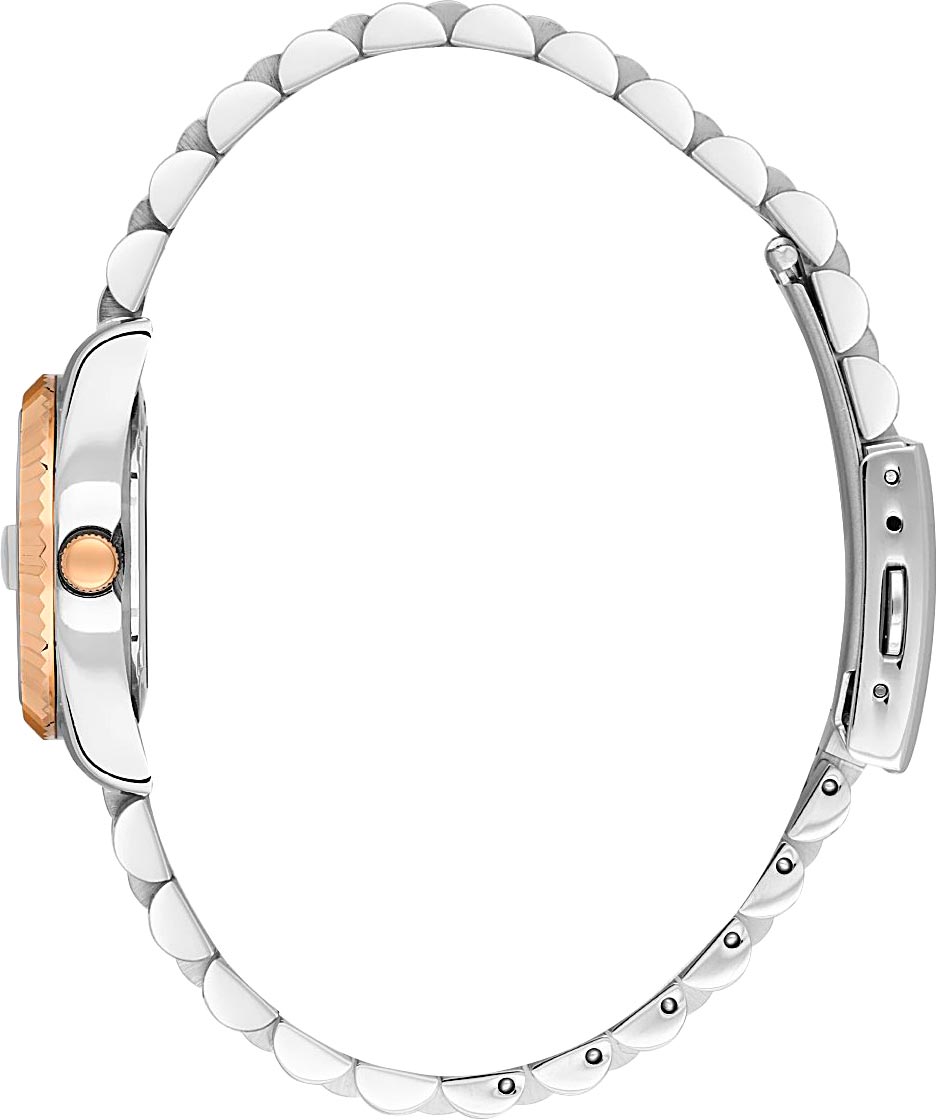 Женские наручные часы. Круглый стальной корпус с матовой и полированной отделкой. Декоративный рифленый безель. Перламутровый циферблат с фирменным логотипом. Накладные метки в виде точек, украшенных кристаллами. Прямоугольные стрелки в стиле Baton.