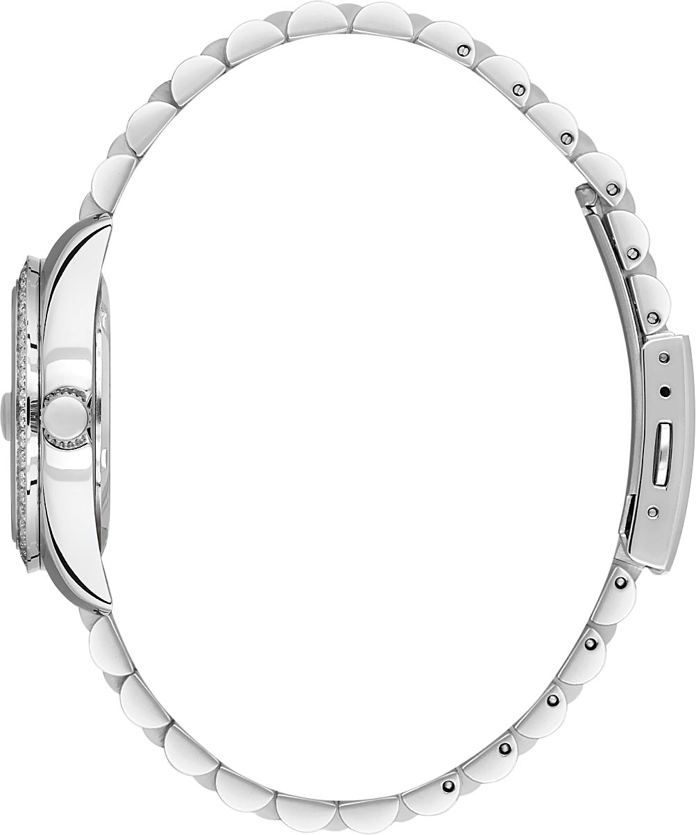 Кварцевые женские наручные часы. Круглый стальной корпус с полированной и матовой отделкой. Безель украшен паве из сверкающих кристаллов. Циферблат выполнен по технологии Sunray (солнечные лучи) и украшен фирменным логотипом. Накладные метки в виде штрихов.