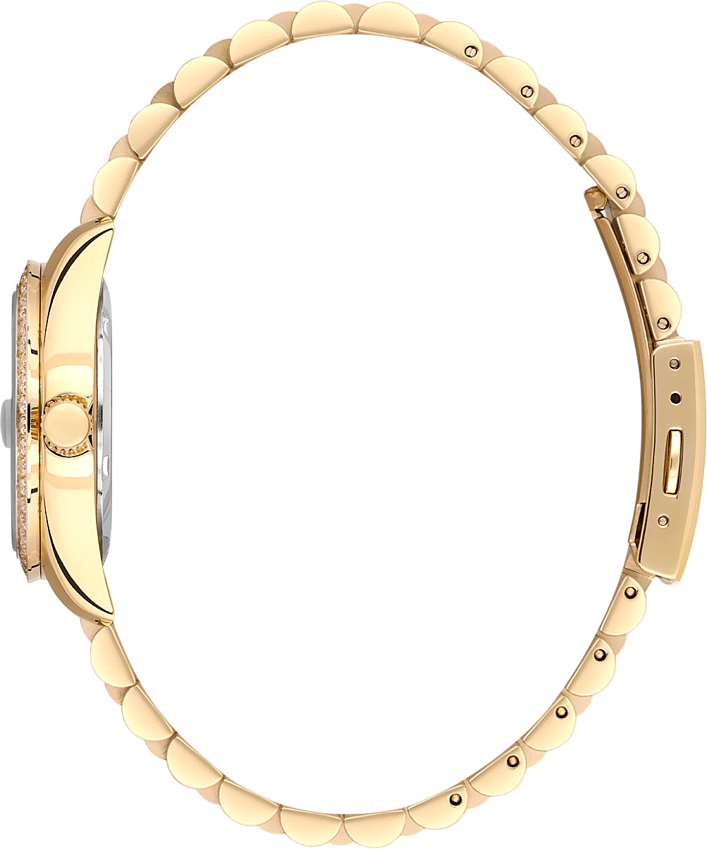 Кварцевые женские наручные часы. Круглый стальной корпус с полированной и матовой отделкой. Безель украшен паве из сверкающих кристаллов. Циферблат выполнен по технологии Sunray (солнечные лучи) и украшен фирменным логотипом. Накладные метки в виде штрихов.