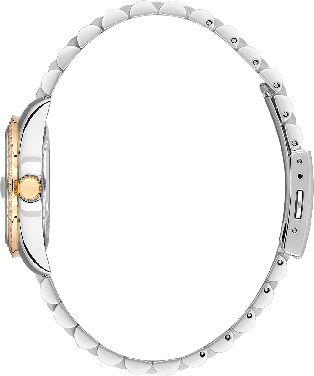 Кварцевые женские наручные часы. Круглый стальной корпус с полированной и матовой отделкой. Безель украшен паве из сверкающих кристаллов. Циферблат выполнен по технологии Sunray (солнечные лучи) и украшен фирменным логотипом. Накладные метки в виде штрихов.
