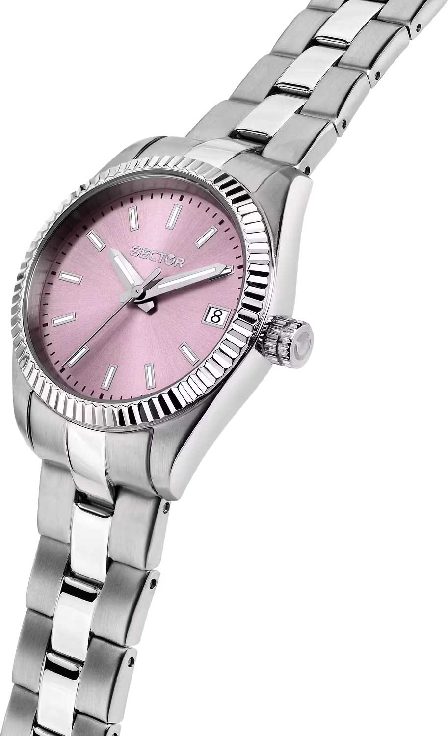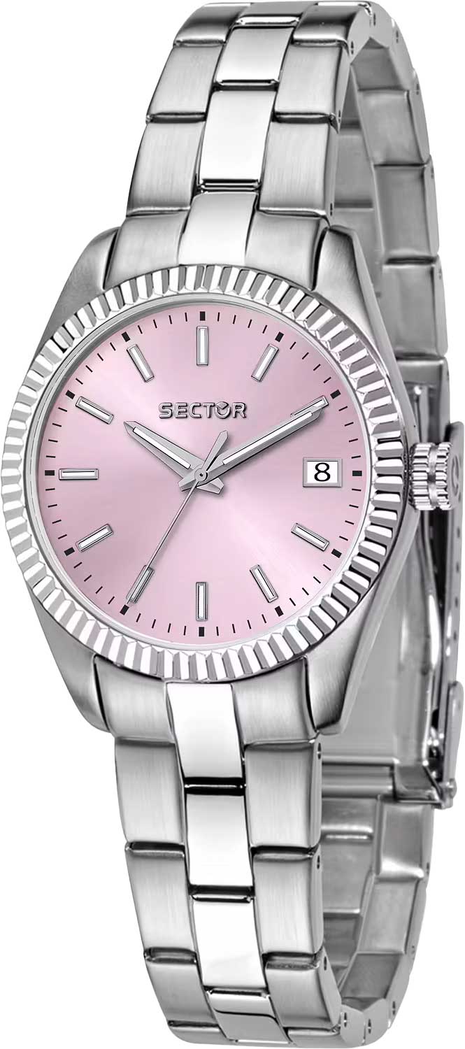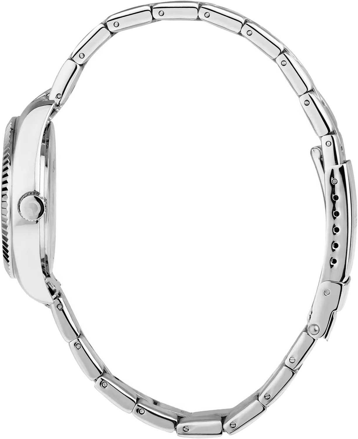 Женские часы. Циферблат с метками в виде штрихов выполнен по технологии Sunray (солнечные лучи). Окошко даты находится в положении 3 часа. Рифленый безель. Браслет с раскладывающейся застежкой. Застежка с системой блокировки.
