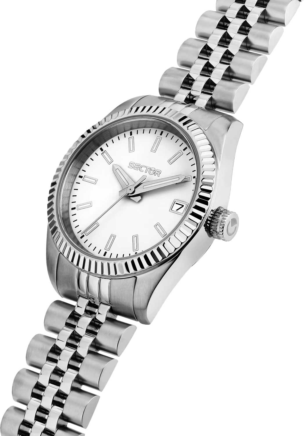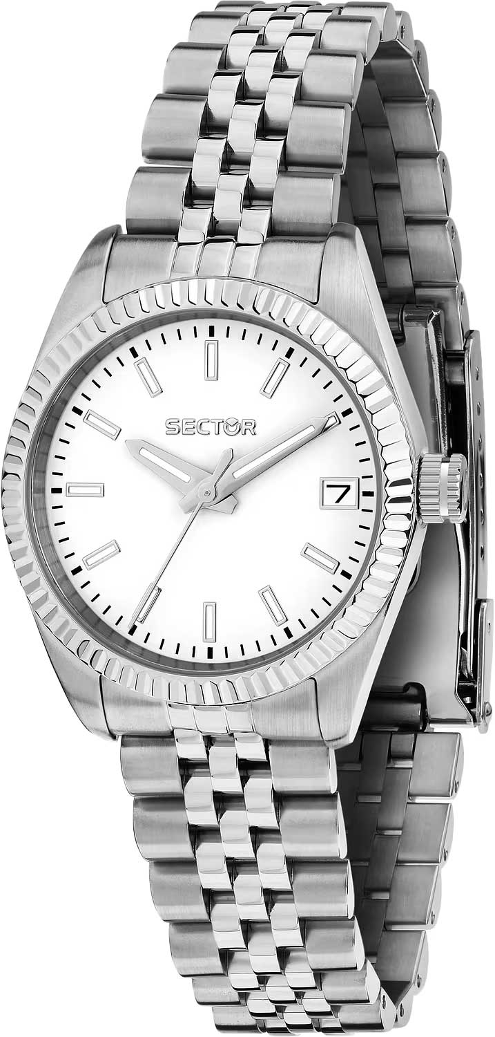 Женские часы. Циферблат с метками в виде штрихов. Окошко даты находится в положении 3 часа. Рифленый безель. Браслет с раскладывающейся застежкой. Застежка с системой блокировки.