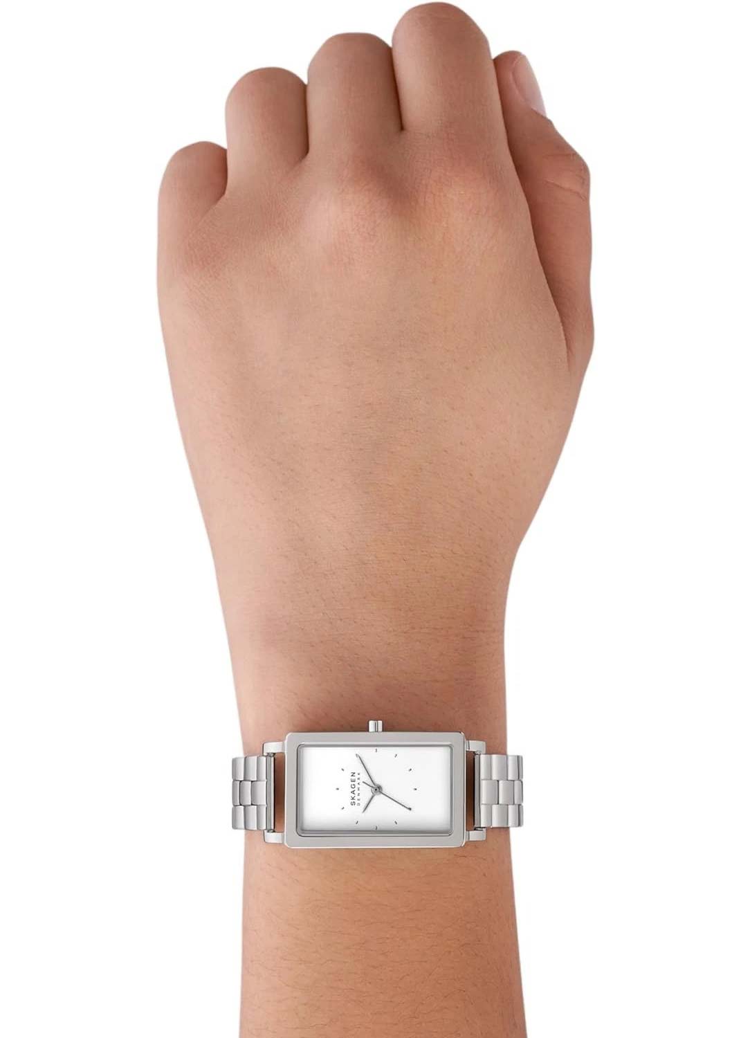 Женские кварцевые часы Hagen Lille. Прямоугольный стальной корпус. Циферблат с метками в виде штрихов. Стальной браслет с раскладывающейся застежкой.