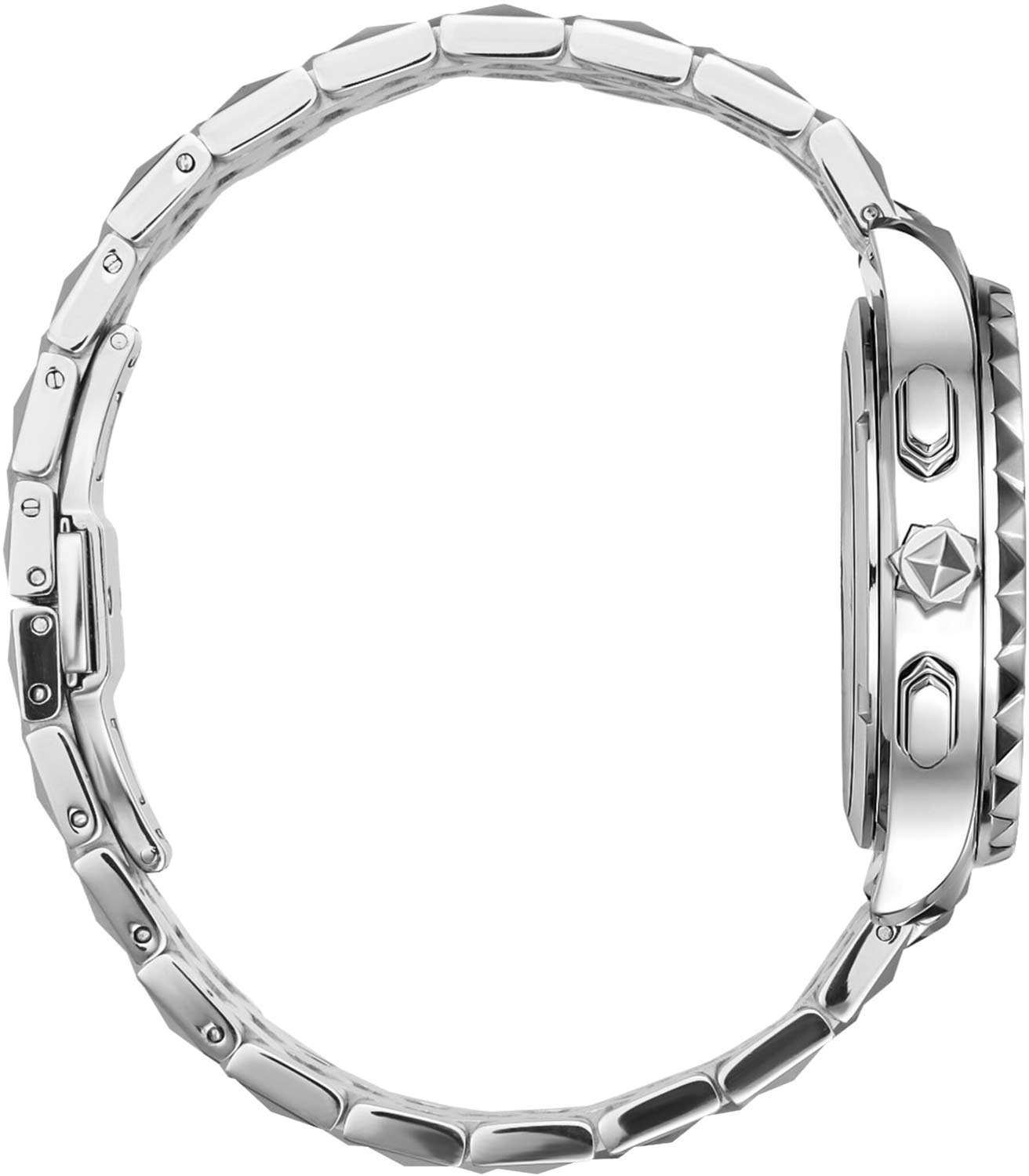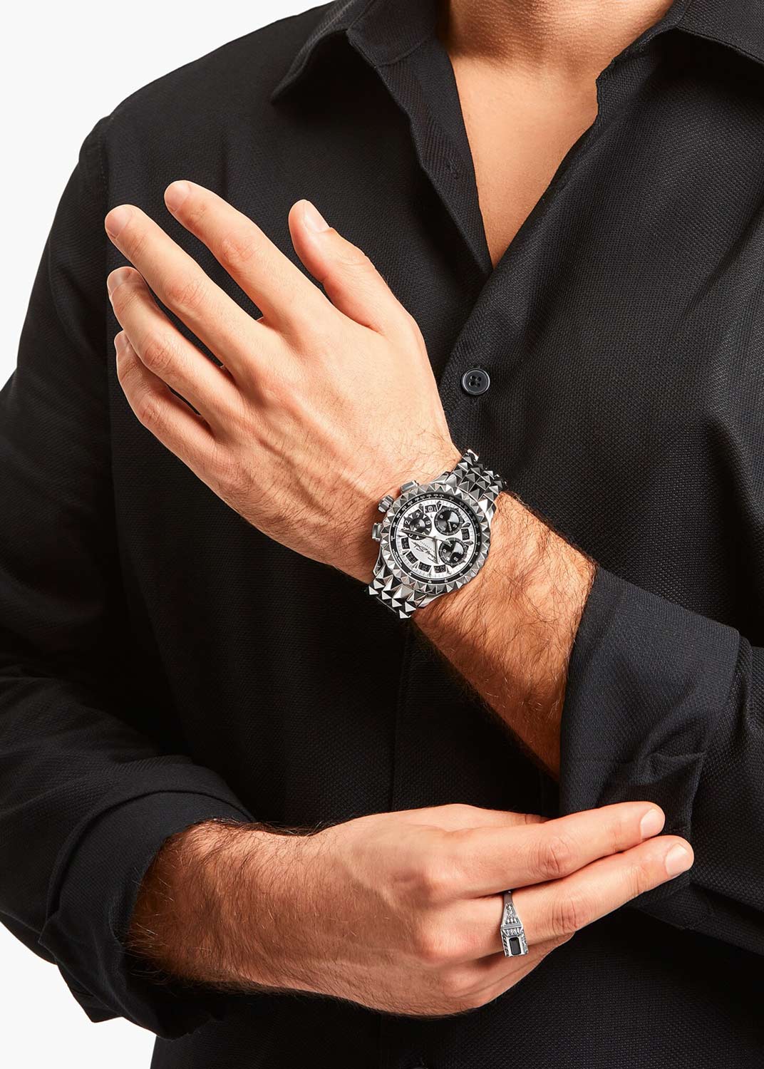 Мужские часы-хронограф Rebel at Heart Chronograph. Аксессуар оснащен функцией супербегуна, способной измерять сотые доли секунды и тахиметрической шкалой, с помощью которой можно измерять скорость. Есть функция остановки секундной стрелки. Пирамидальная форма является центральным стилистическим элементом исполнения часов.