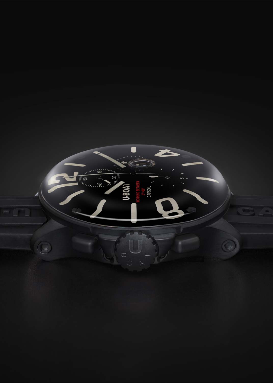 Capsoil. Мужские наручные часы-хронограф с секундомером. Стальной корпус заполнен специальным маслом, создающим иллюзию отсутствия стекла. Видимый воздушный пузырек на циферблате компенсирует температурные колебания.