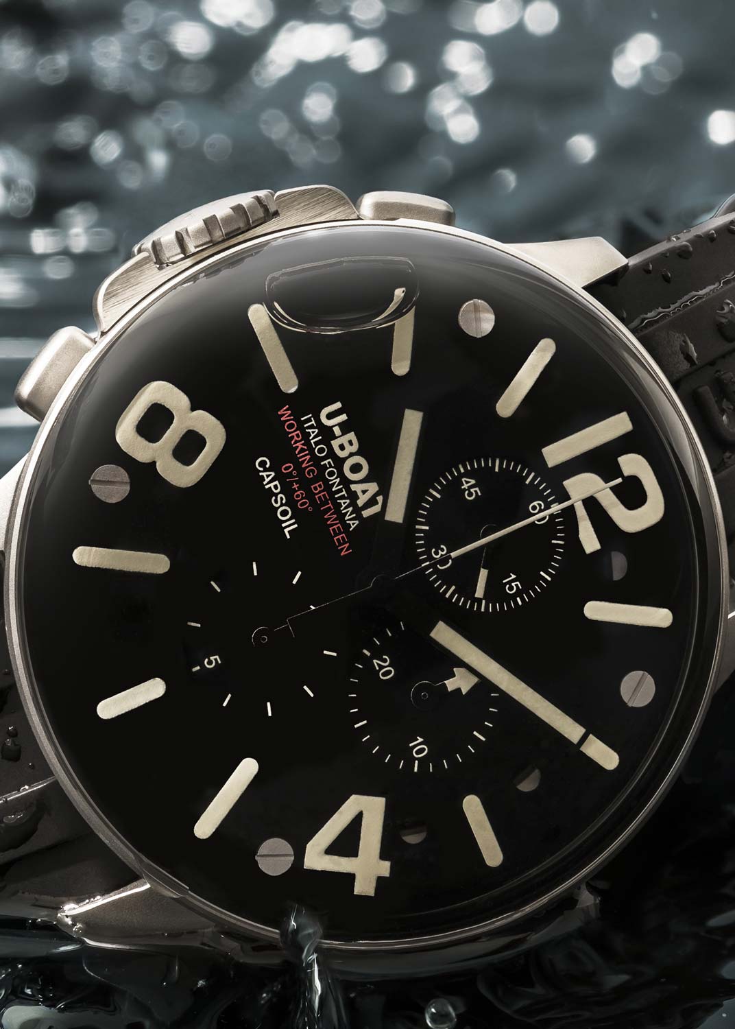 Capsoil. Мужские наручные часы-хронограф с секундомером. Стальной корпус заполнен специальным маслом, создающим иллюзию отсутствия стекла. Видимый воздушный пузырек на циферблате компенсирует температурные колебания.