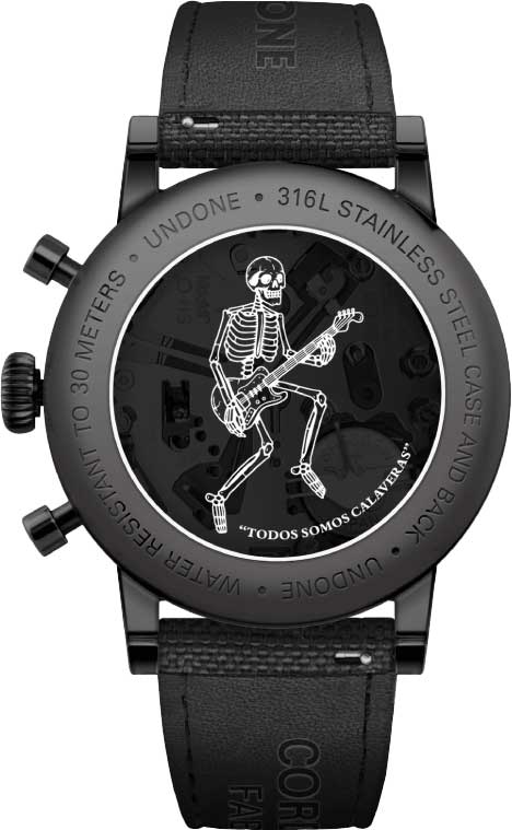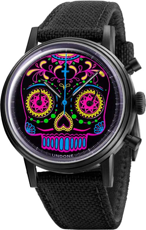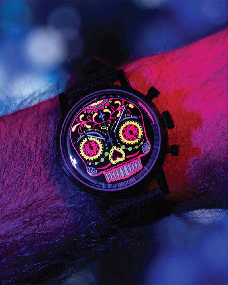 Calavera Neon. Модель вдохновлена работами мексиканского художника Хосе Гуадалупе Посада, который прославился своими карикатурами. Часы-хронограф с секундомером. Циферблат украшен изображением яркого черепа, который нанесен флуоресцентной краской. Прозрачная задняя крышка украшена скелетом, играющим на гитаре, и знаменитой фразой художника «Todos Somos Calaveras» (Мы все скелеты). Ремешок с классической застежкой и системой быстрой замены.