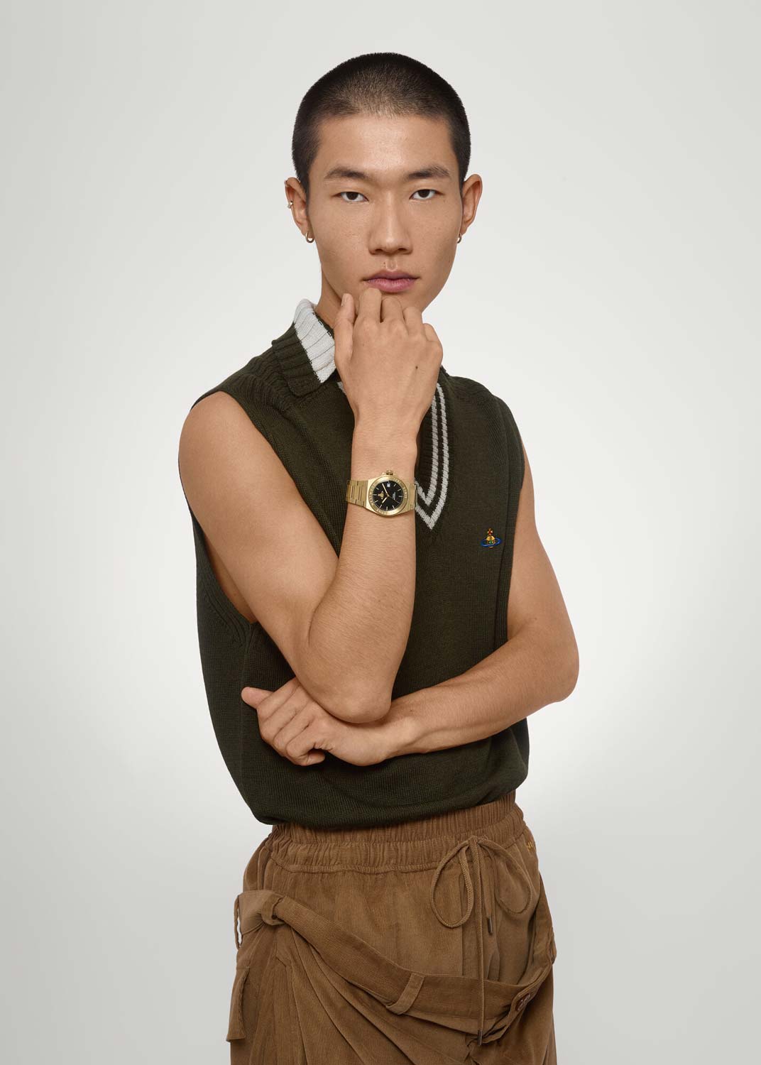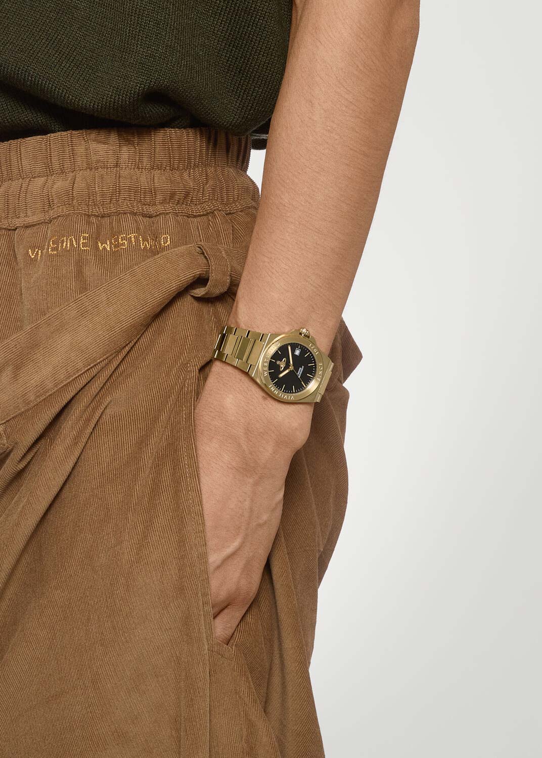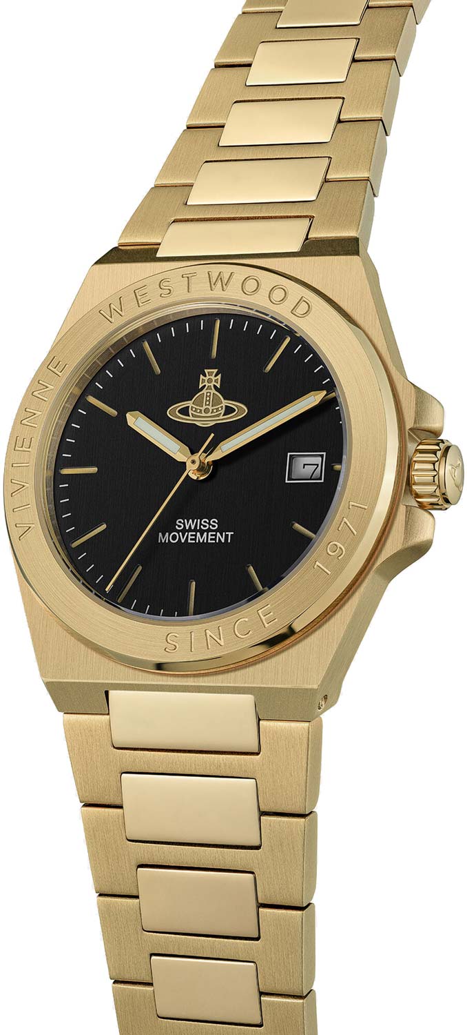 Hanwell. Наручные унисекс часы. Круглый стальной корпус. Безель с гравировками ''Vivienne Westwood'' и ''Since 1971''. Циферблат метками в виде штрихов украшен фирменным логотипом. Окошко даты находится в положении 3 часа. Заостренные стрелки в стиле Baton. Рифленая заводная головка с защитой. Удобный стальной браслет с раскладывающейся застежкой.
