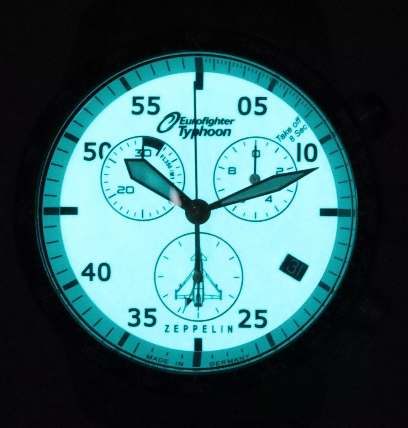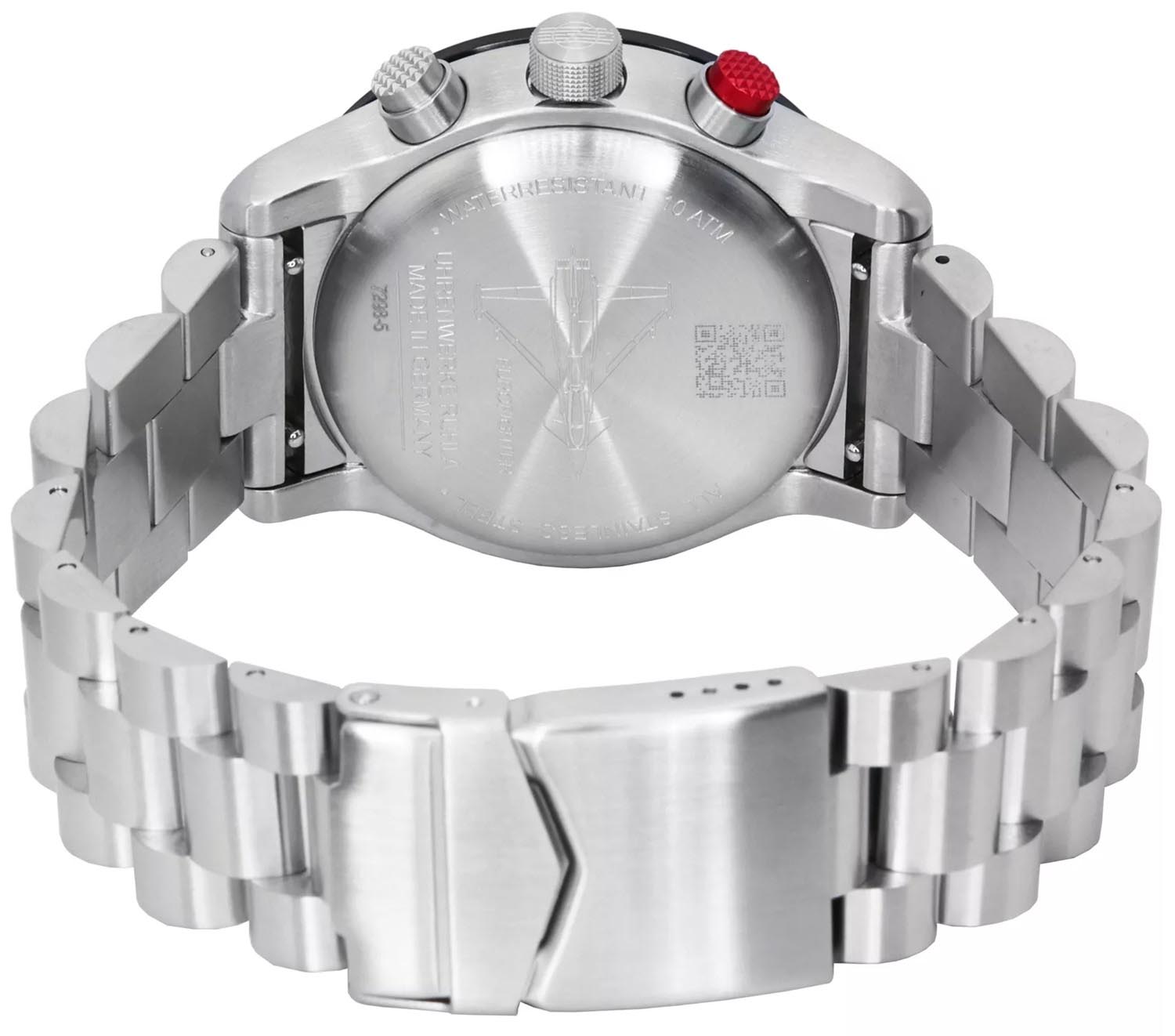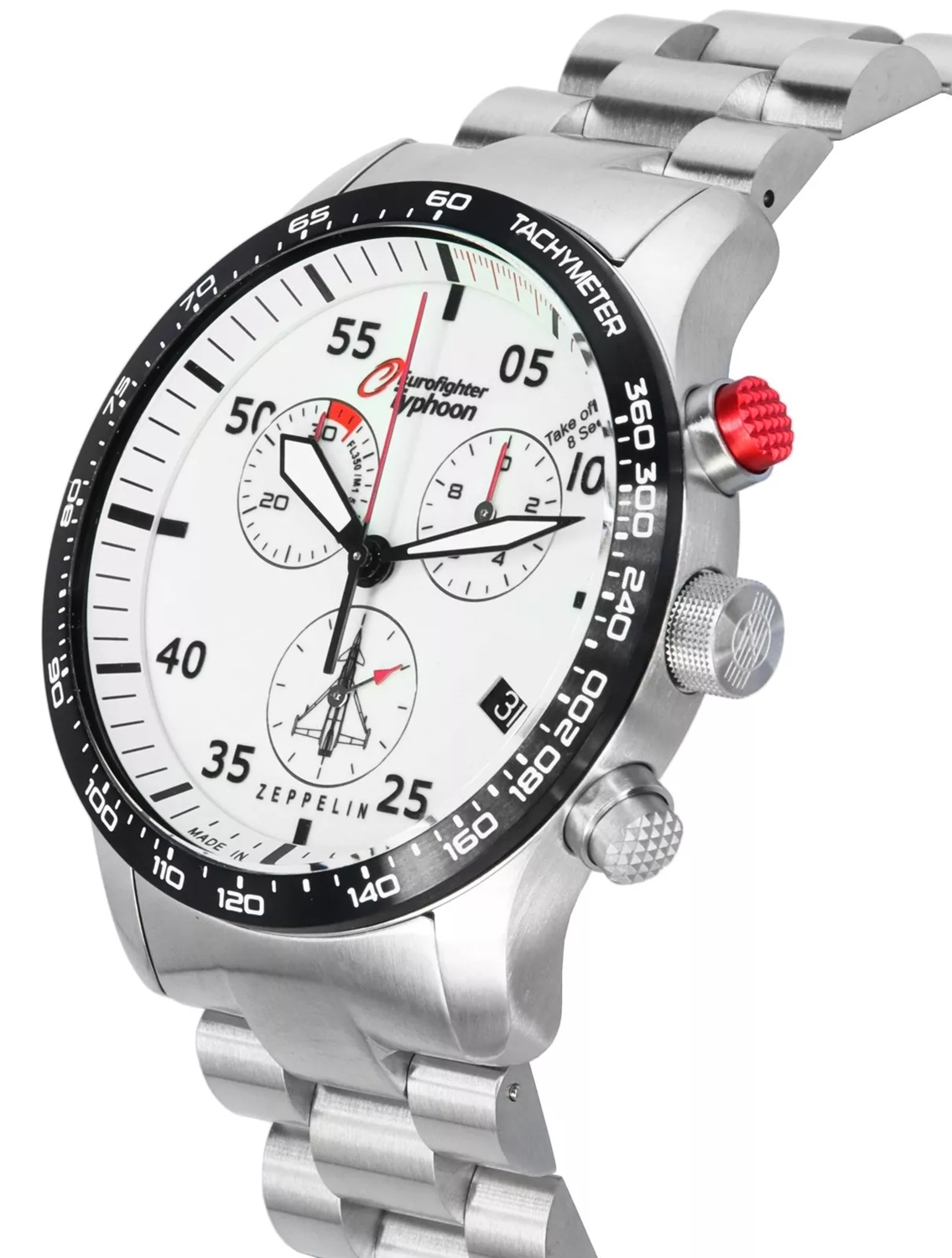 Функциональные часы-хронограф для стильных мужчин, идущих в ногу со временем вопреки всевозможным преградам. Часы-хронограф с секундомером и тахиметром Eurofighter Typhoon. Секундомер с точностью 1/10с. Метки в виде штрихов и арабских цифр. Окошко даты находится в положении 4 часа. Стальной браслет.