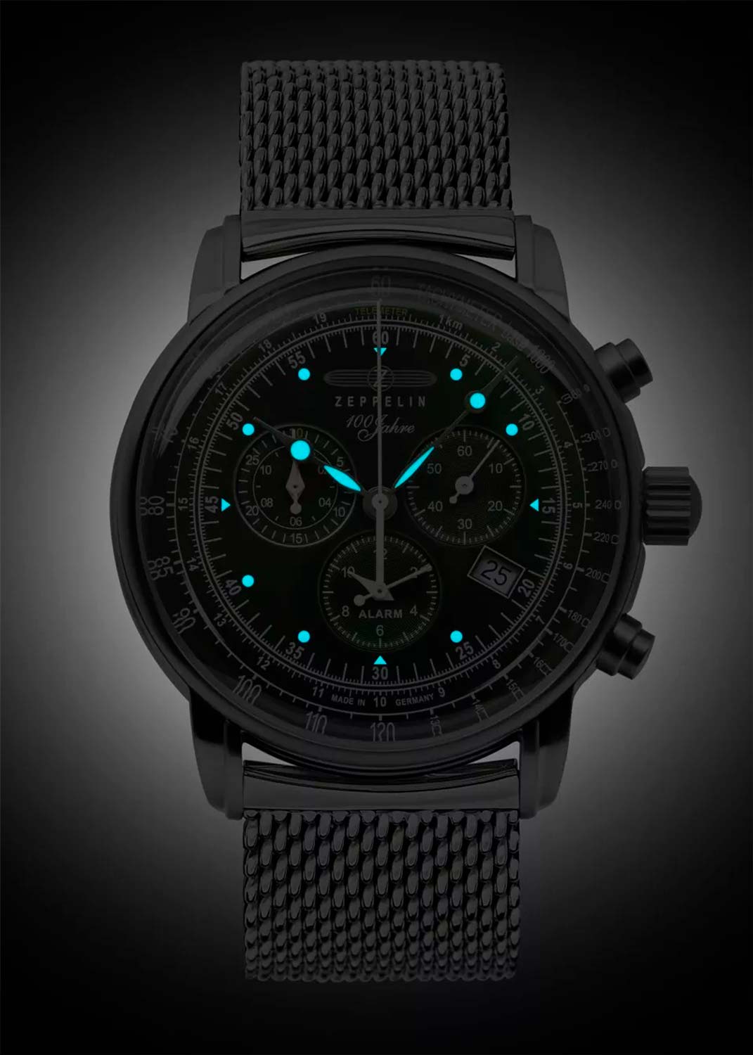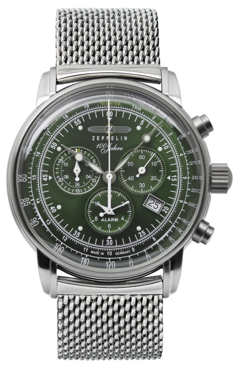 Часы с дополнительными функциями хронографа являются идеальным выбором для современного ритма жизни. Часы-хронограф с секундомером и тахиметром 100 Years Zeppelin ED. 1. Телеметрическая шкала. Окошко даты. Метки в виде точек. Миланский стальной браслет.