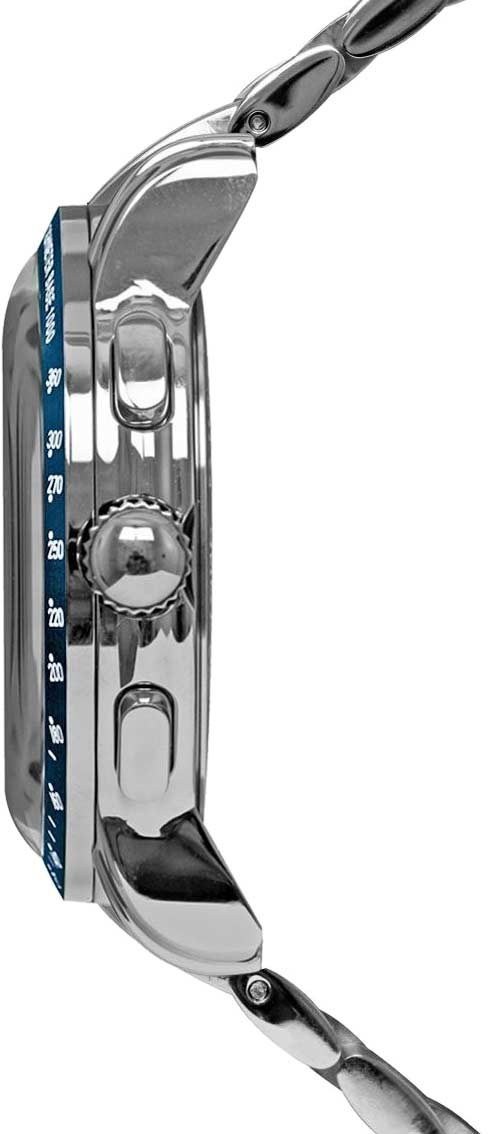 Мужские наручные часы-хронограф секундомером и тахиметром New York Chronograph. Круглый корпус из полированной стали. Фиксированный безель с тахиметрической шкалой. Циферблат выполнен по технологии Sunray (солнечные лучи). Серебристые накладные метки в виде штрихов. Окошко даты находится между часовыми отметками 4 и 5.