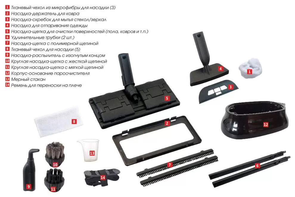 - Насадкидля отпаривания ткани; для мытья окон и зеркал; изогнутое сопло; круглая щетка; прямоугольная щетка