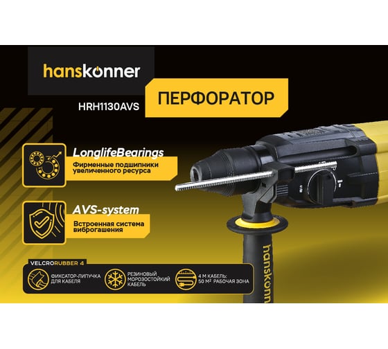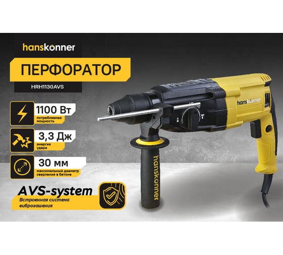 Перфоратор Hanskonner 1100Вт, 30мм, 3.3Дж, 0-5100уд/мин, 3 реж, 4м кабель,ВИБРОЗАЩИТА HRH1130AVS