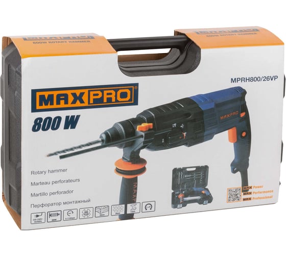 Перфоратор монтажный MAX-PRO 800 Вт, 0-1100 об/мин, 2,8 Дж, 3 режима, Д/Б/М-30/26/13, 3,4 кг, SDS-PLUS, антивибрационная ручка, резиновые вставки, рез 85084