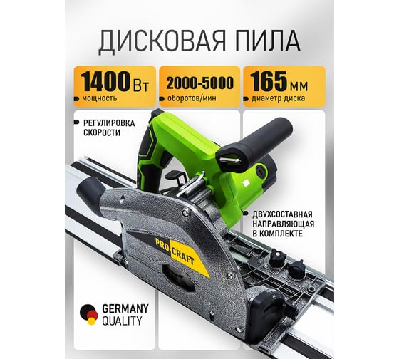 Пила дисковая PROCRAFT 1400 Вт, 165 мм, пропил 59 мм, 2000-5000 об/мин, направляющая 140 см KR2100