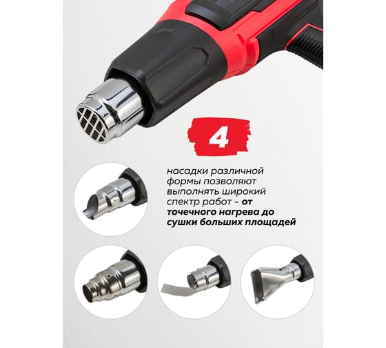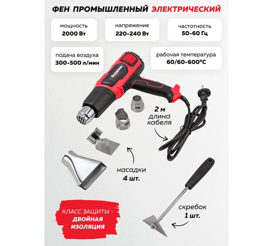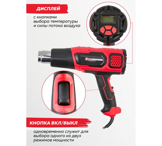 Промышленный электрический фен с дисплеем и насадками Forcekraft 220в, 50/60гц, 2000вт, 60-600с, 300-500л/мин, класс защиты-двойная изоляция FK-HG55-2000LCD(52343)