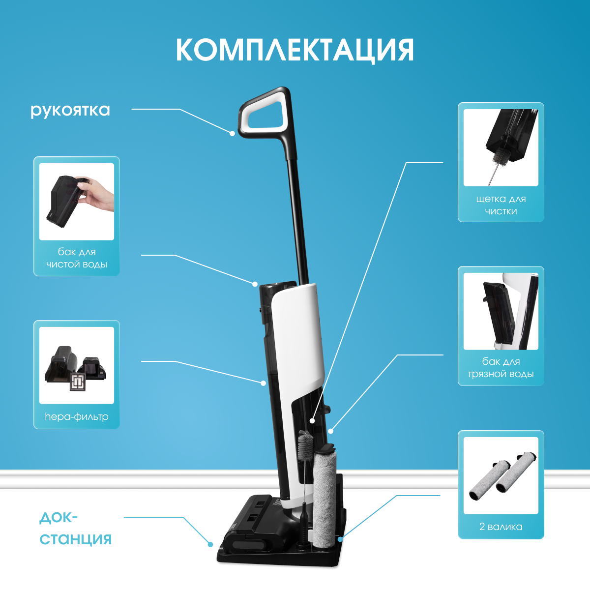 - Комплект поставкиБеспроводной пылесос - 1 шт; Док-станция - 1 шт; Приспособление для чистки прибора - 1 шт; HEPA-фильтр - 1 шт; Бак для грязной воды - 1 шт; Бак для чистой воды - 1 шт; Рукоятка - 1 шт; Инструкция