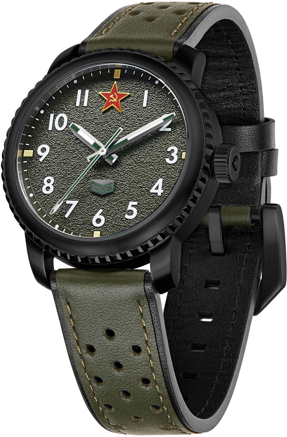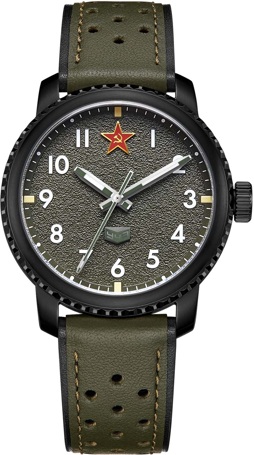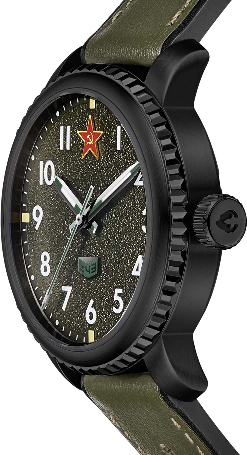 Мужские наручные часы. Запас хода 42 часа. Круглый стальной корпус с рифленым безелем напоминает покрышку с протектором. Циферблат защитного цвета украшен алой звездой и защищен прочным сапфировым стеклом. Метки в виде арабских цифр и штрихов. Геометрия стрелок напоминает форму снарядов.