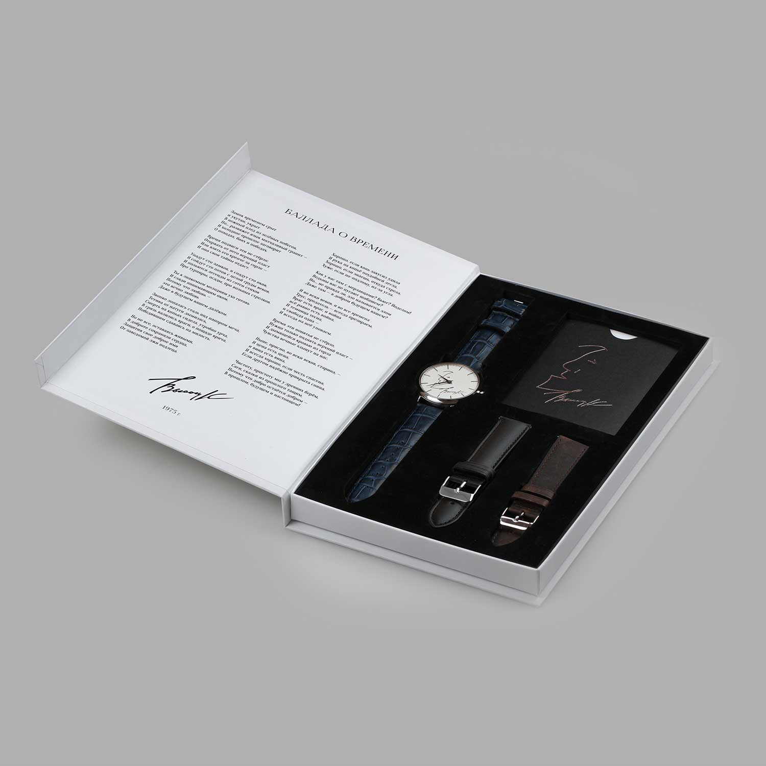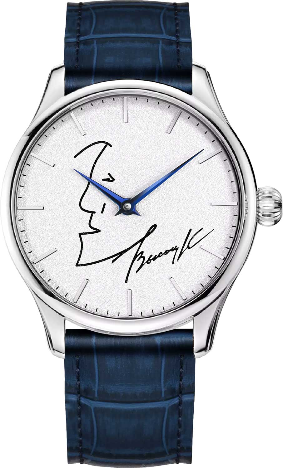 Элегантные часы непременно понравятся поклоннику творчества Владимира Высоцкого и без сомнения обратят на себя ваше пристальное внимание. Lincor UNI. Мужские механические часы посвящены знаменитому поэту и актеру Владимиру Семеновичу Высоцкому. В механизме 17 камней. Циферблат повторяет собой белый лист бумаги, на котором Владимир Семенович когда-то оставил памятный рисунок, автопортрет, совмещенный с автографом. Метки в виде штрихов. Рифленая заводная головка. Прозрачная задняя крышка крепится на 6-ти винтах и украшена словом «добра», которое Владимир часто добавлял к своему автографу. Ремешок из натуральной итальянской кожи с раскладывающейся застежкой и системой быстрой замены. В комплекте 2 сменных кожаных ремешка. Подарочная упаковка.