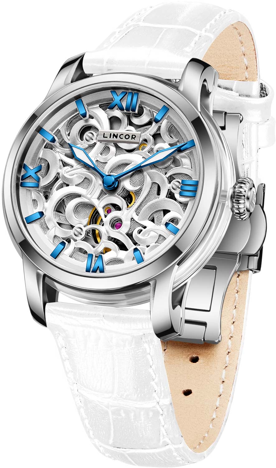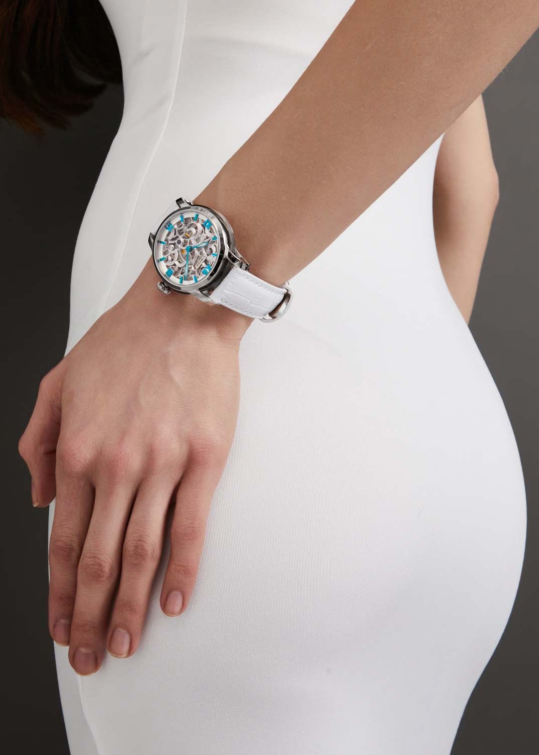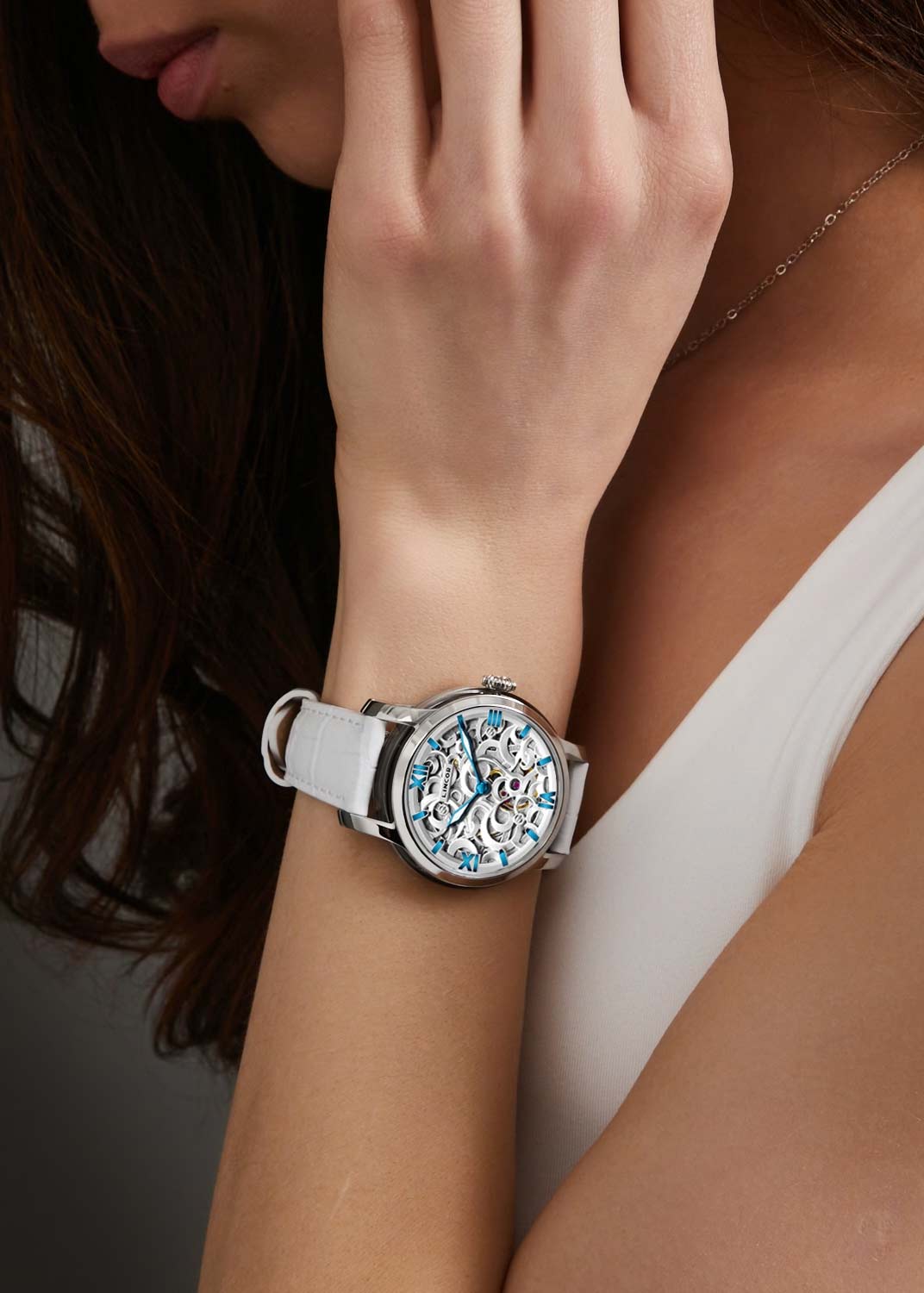 Лимитированная серия – 300 экземпляров. Скелетонизированные женские наручные часы. В механизме 24 камня,частота 28800 полуколебаний в час. Запас хода до 42 часов. Возможность ручного завода. Функция stop-second. Ротор механизма украшен гравировкой.