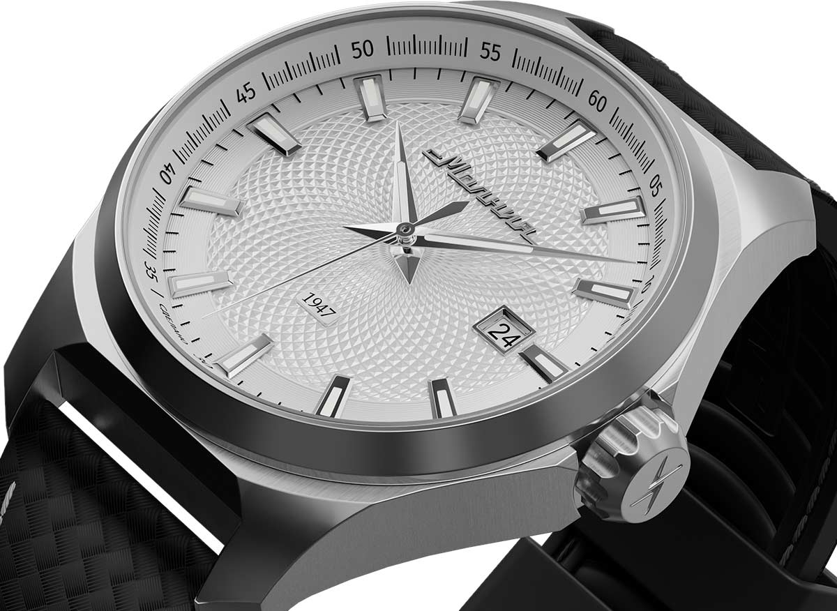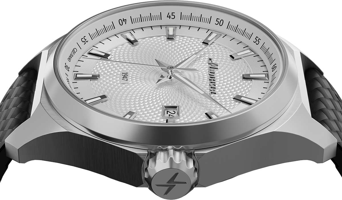 Метки и стрелки с люминесцентным покрытием SuperLuminova, которое светится в темноте после непродолжительной зарядки на свету. Окошко даты находится в положении 3 часа. Рифленая заводная головка с защитой украшена фирменным логотипом.