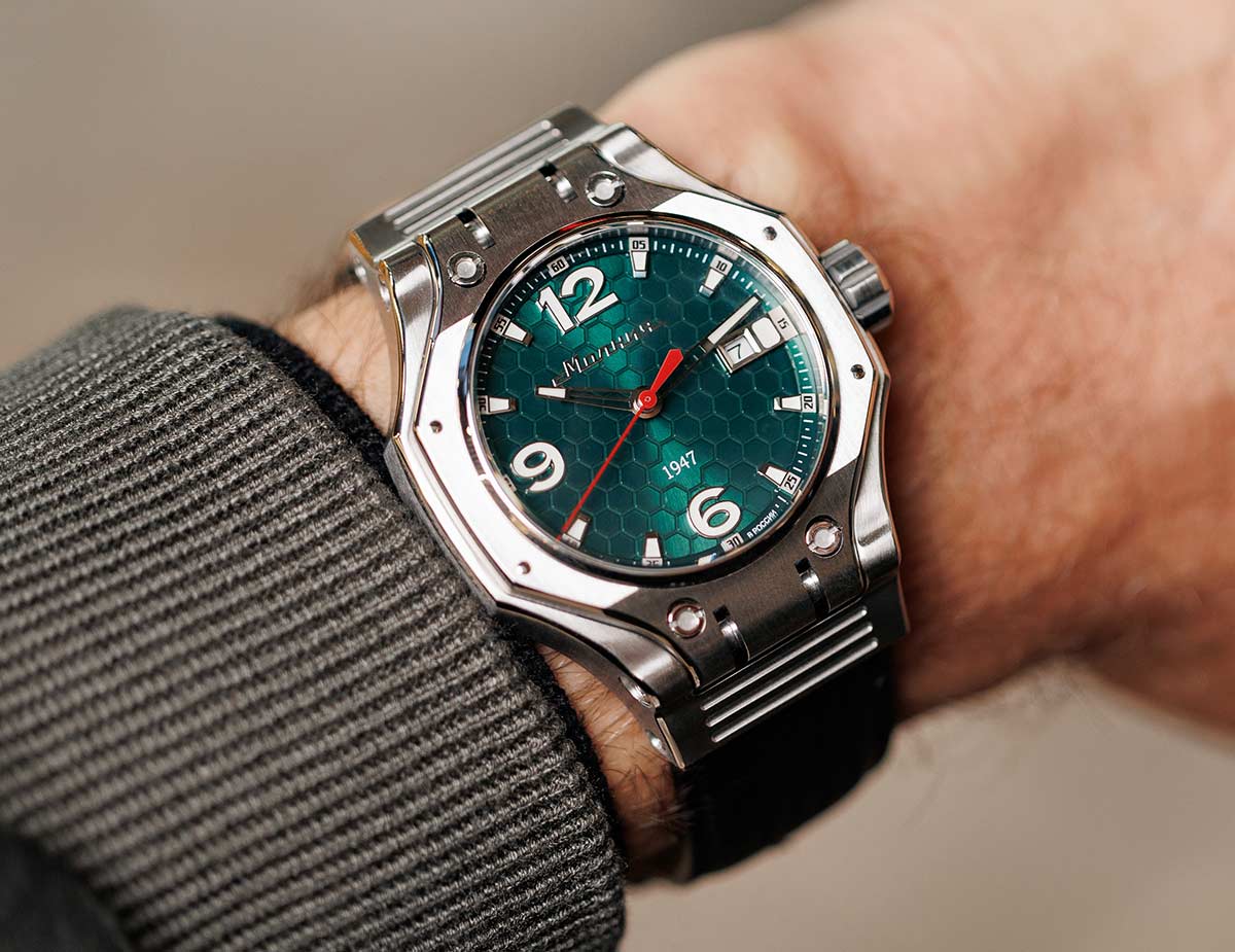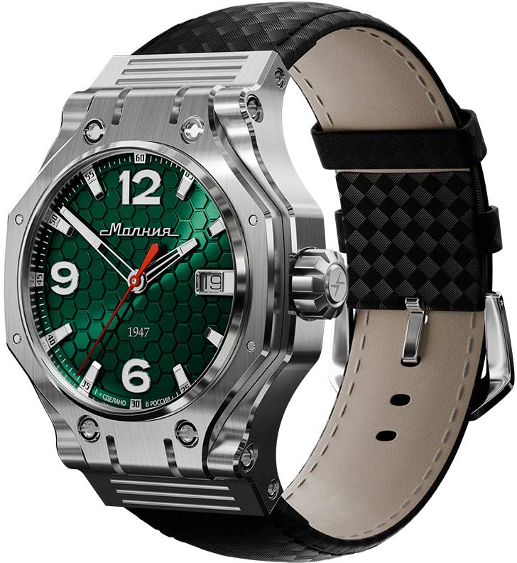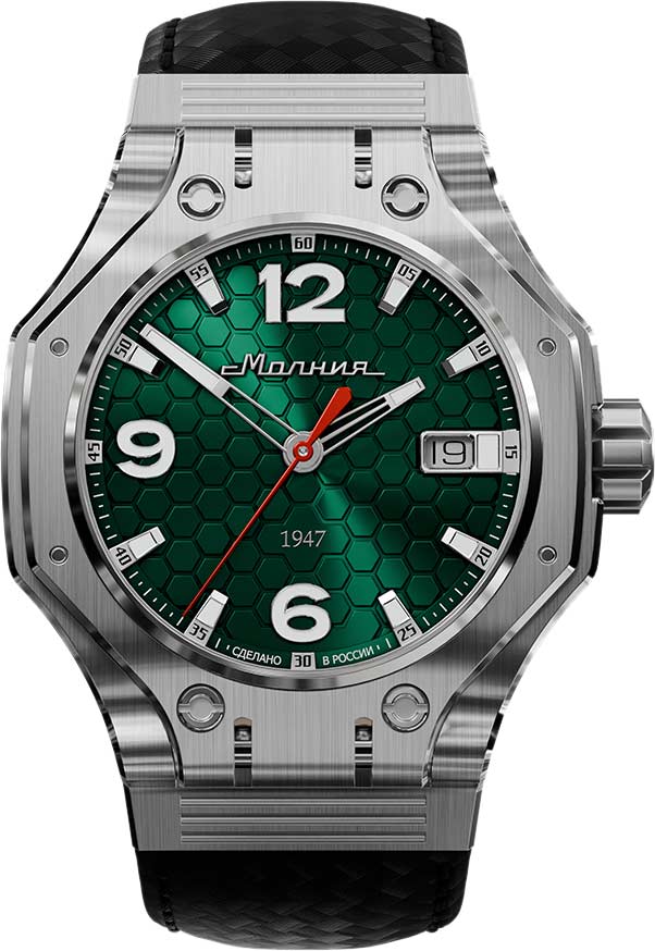 Hyron TCB — плод творческого сотрудничества «Молнии» и знаменитого часового дизайнера Йорга Хайзека. Обновленная модель сохраняет уникальный стиль, выделяясь сложной геометрией и отражая дух стремления и победы. Мужские наручные часы. В механизме 21 камень, частота 21600 полуколебаний в час. Запас хода 42 часа. Противоударное устройство балансового узла механизма. Функция stop-second. Стальной корпус сконструирован в форме профиля башни танка Т-90. Циферблат с принтом в виде сот выполнен по технологии Sunray (солнечные лучи) и защищен прочным сапфировым стеклом толщиной 2мм. Метки в виде штрихов и арабских цифр. Окошко даты находится в положении 3 часа. Метки и стрелки с люминесцентным покрытием SuperLuminova, которое светится в темноте после непродолжительной зарядки на свету. Рифленая заводная головка украшена фирменным логотипом. Прозрачная задняя крышка крепится на 8-ми винтах. Карбоновый ремешок с классической застежкой. Производитель оставляет за собой право вносить изменения во внешний вид часов. При заказе уточняйте у менеджера выбранный вариант.