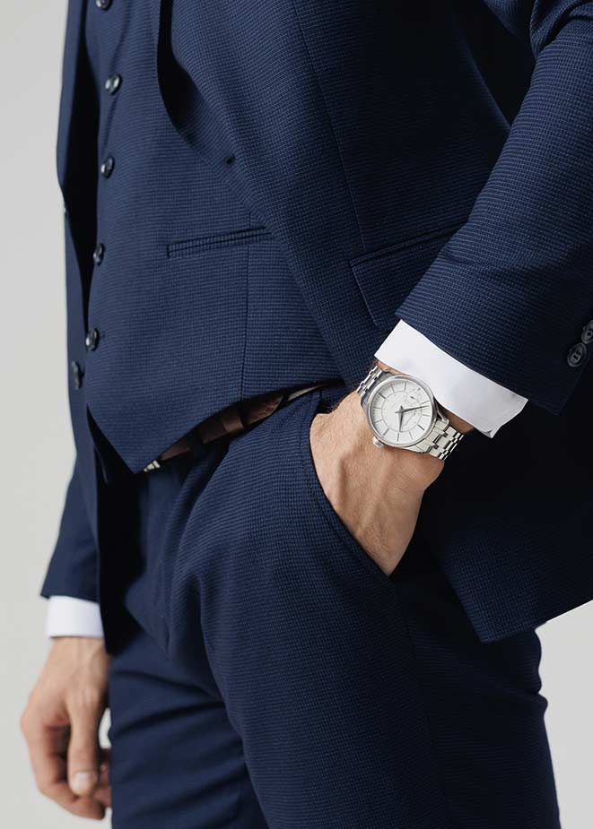 Круглый стальной корпус с полированной поверхностью. Циферблат с накладными метками в виде штрихов защищен прочным сапфировым стеклом толщиной 2мм. Клиновидные стрелки в стиле Dauphine. Секундная стрелка вынесена на отдельный циферблат.