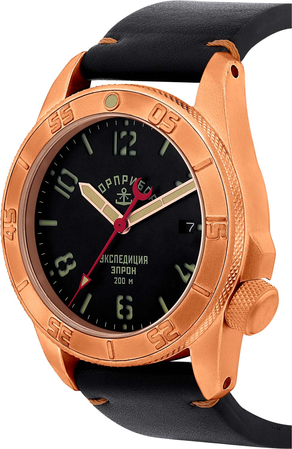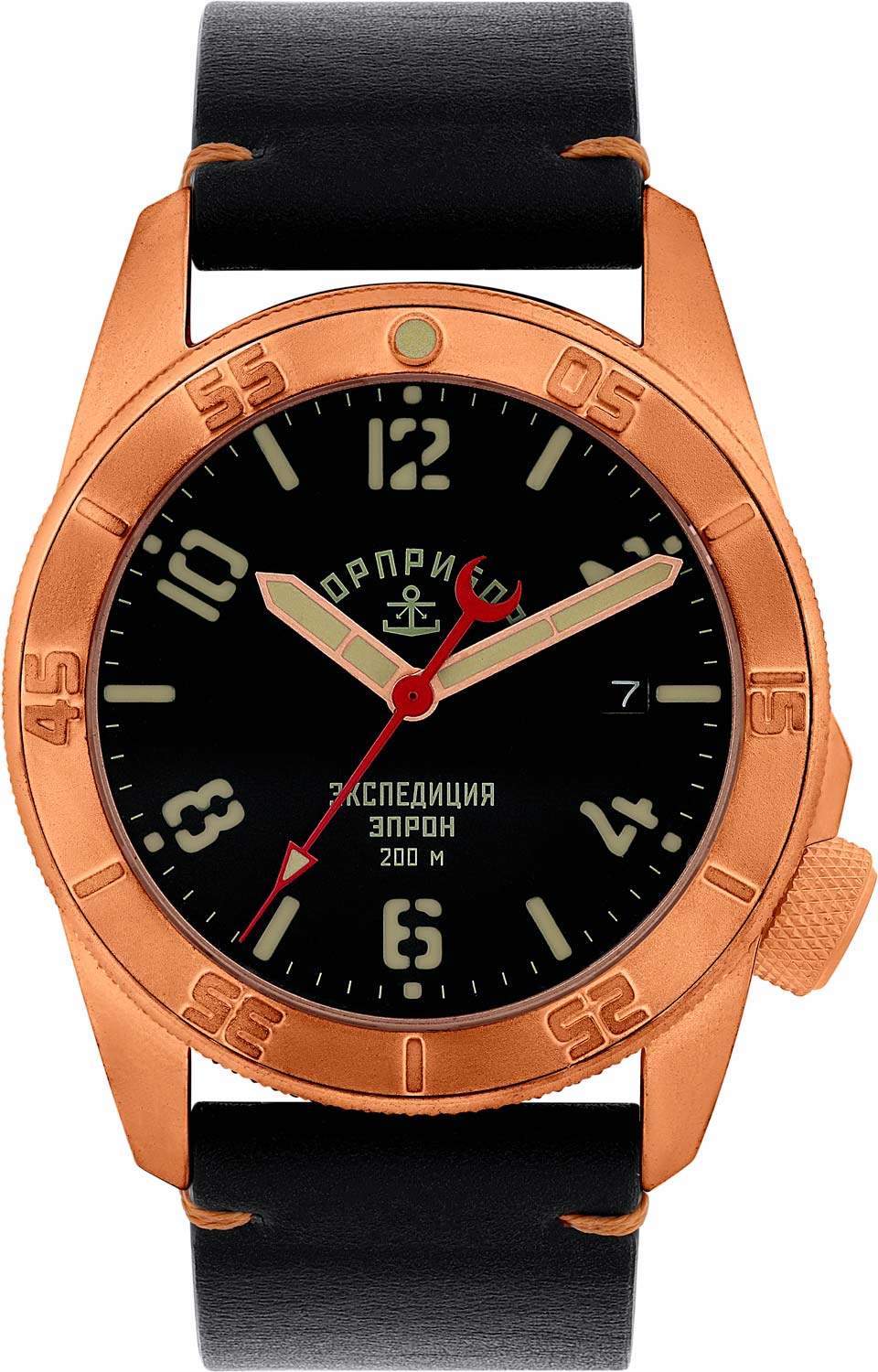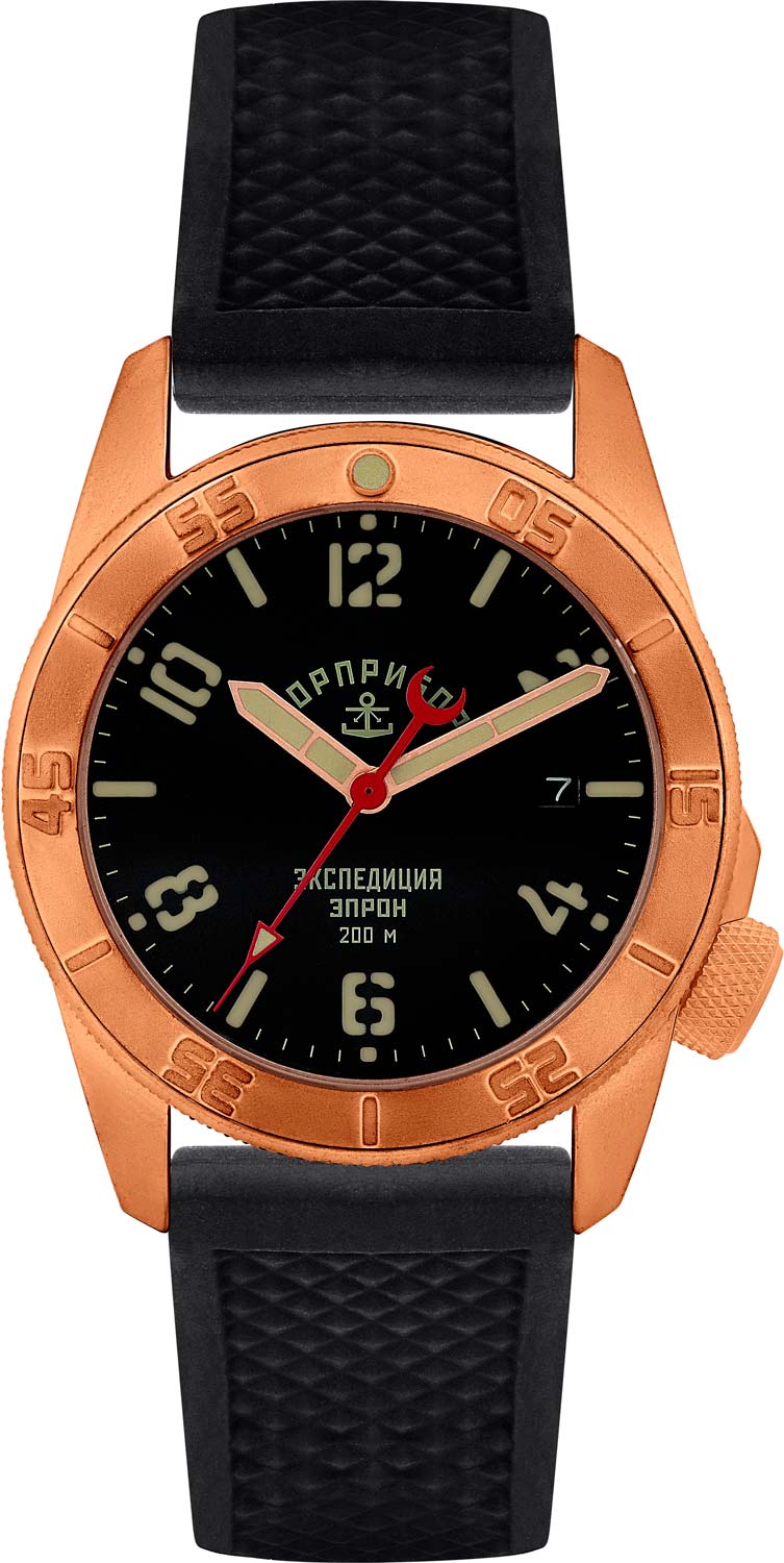 Круглый корпус выполнен из бронзы (CuSn8) и украшен надписью «ЭПРОН» на боковой поверхности. Циферблат с метками в виде штрихов и арабских цифр защищен прочным сапфировым стеклом. Стрелки и метки с люминесцентным покрытием SuperLuminova, которое светится в темноте после непродолжительной зарядки на свету. Окошко даты находится в положении 3 часа.
