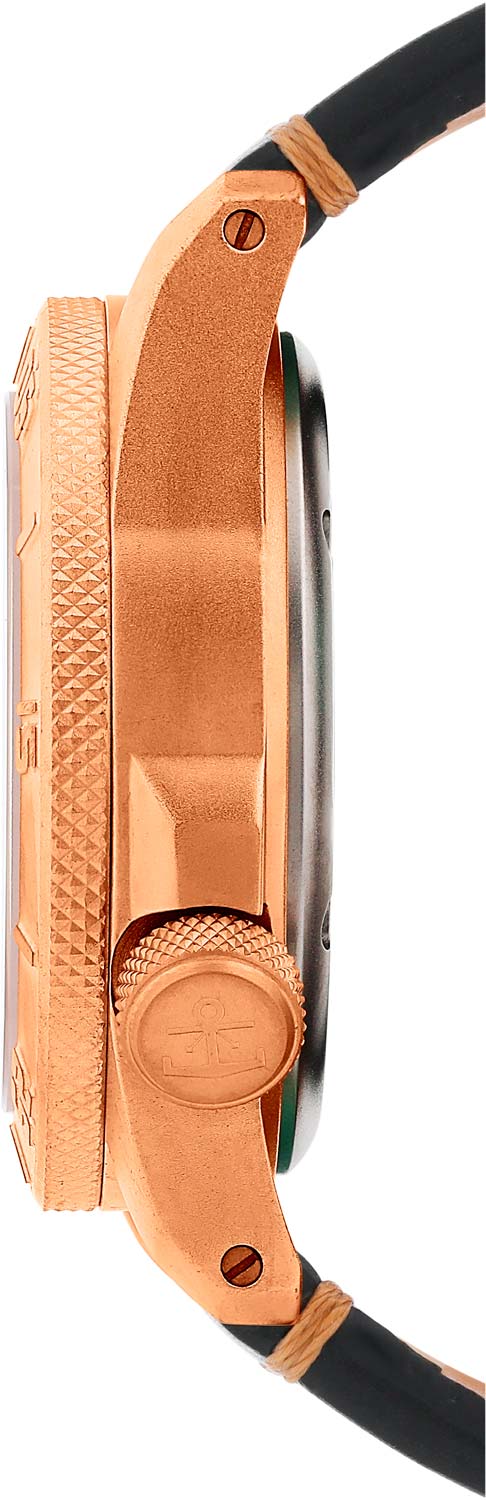 Безель вращается на 120 щелчков. Завинчивающаяся заводная головка с защитой находится в положении 4 часа. Стальная задняя крышка украшена гравировкой. Кожаный ремешок с классической застежкой. В комплекте сменный каучуковый ремешок.