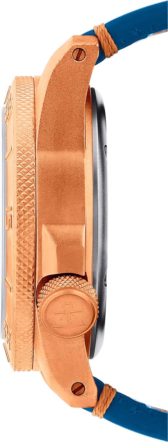 Безель вращается на 120 щелчков. Завинчивающаяся заводная головка с защитой находится в положении 4 часа. Стальная задняя крышка украшена гравировкой. Кожаный ремешок с классической застежкой. В комплекте сменный каучуковый ремешок.