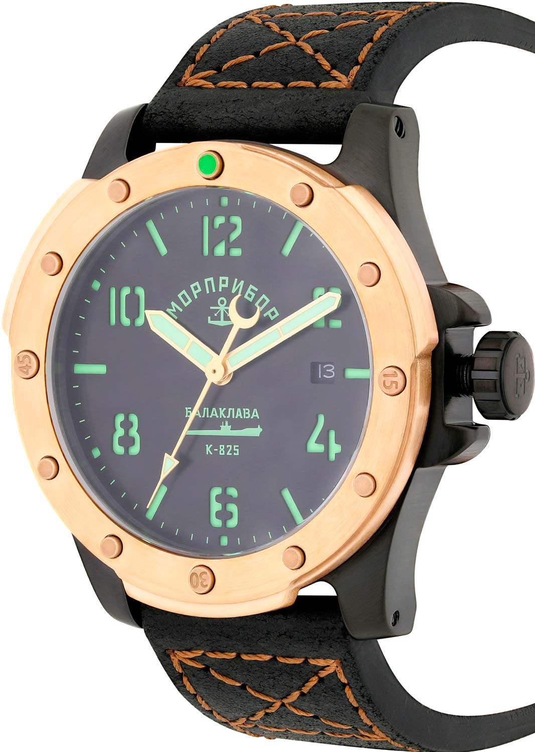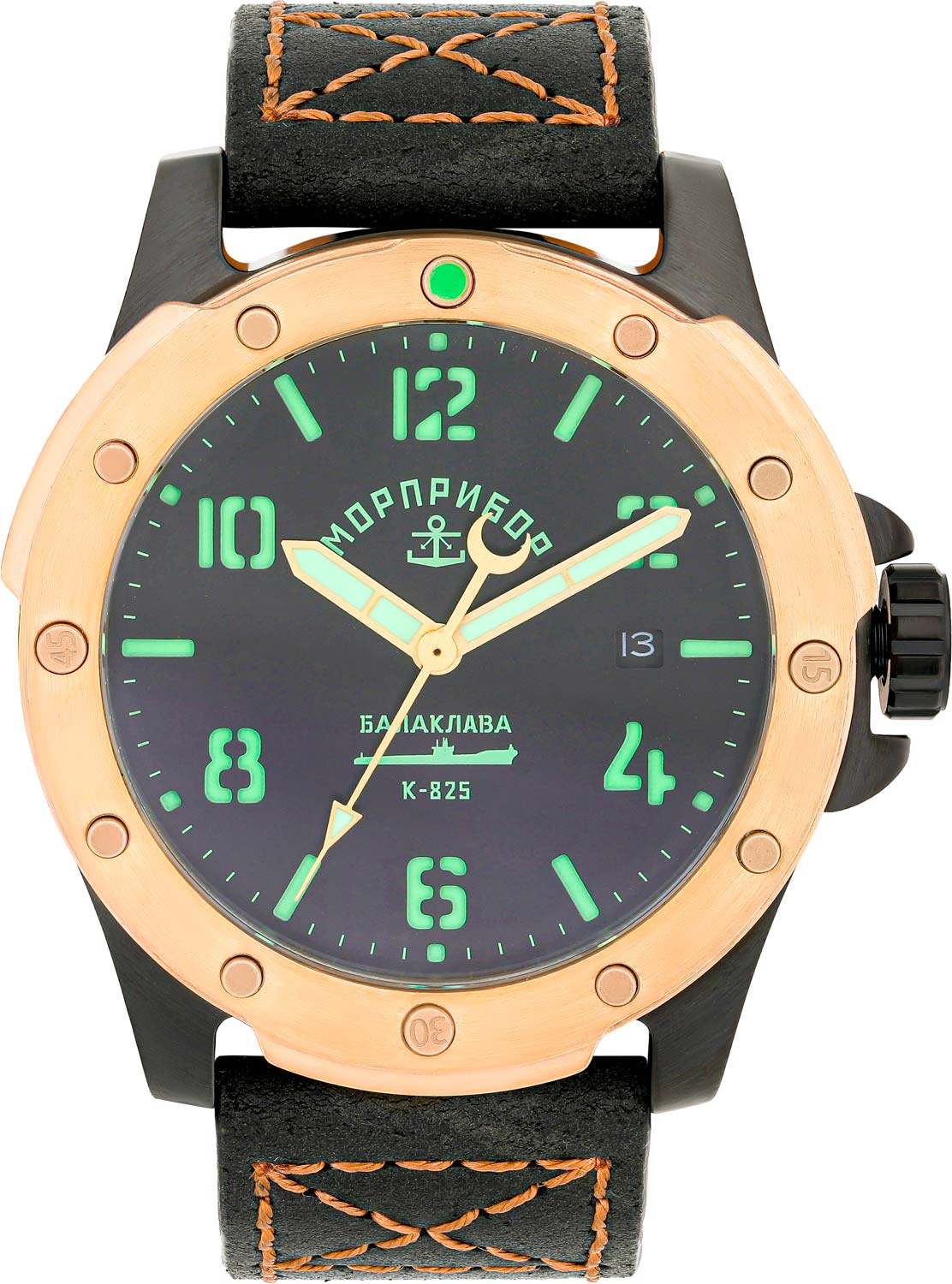 Круглый корпус украшен надписью «Балаклава К-825» на боковой поверхности. Циферблат с метками в виде штрихов и арабских цифр защищен прочным сапфировым стеклом. Стрелки и метки с люминесцентным покрытием SuperLuminova, которое светится в темноте после непродолжительной зарядки на свету. Окошко даты находится в положении 3 часа.