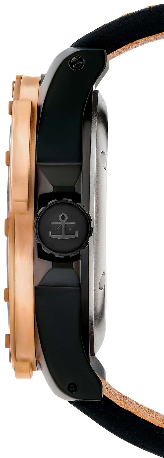 Бронзовый безель вращается на 120 щелчков. Завинчивающаяся заводная головка с защитой. Стальная задняя крышка украшена изображением подводной лодки С-49 из Балаклавского музея. Кожаный ремешок с классической застежкой. В комплекте сменный каучуковый ремешок.