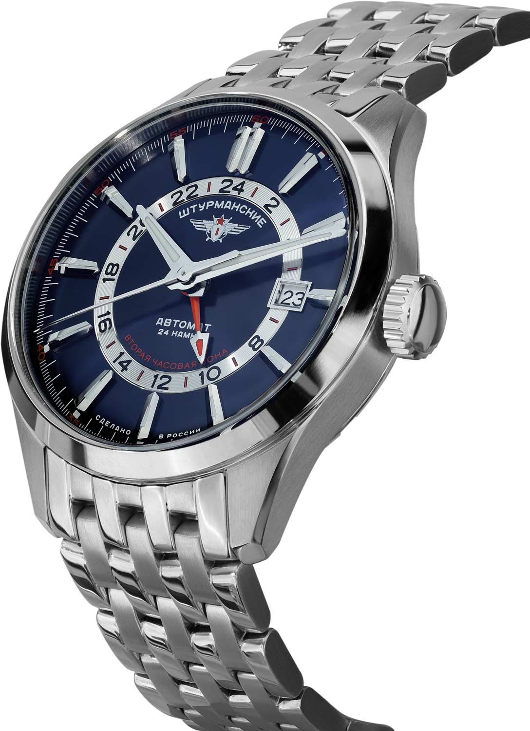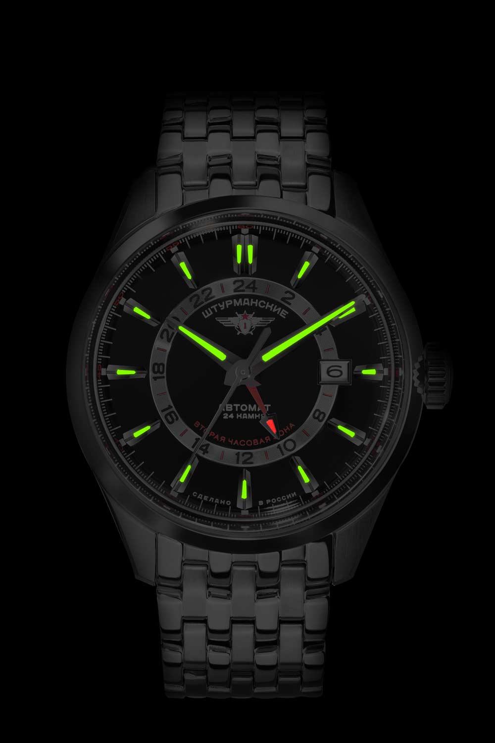 Мужские автоматические часы. Лимитированная серия — 3000 экземпляров. 12-ти и 24-х часовой формат времени. В механизме 24 камня. Запас хода 41 час. Накладные метки в виде штрихов сложной формы. Окошко даты в накладной рамке находится в положении 3 часа.