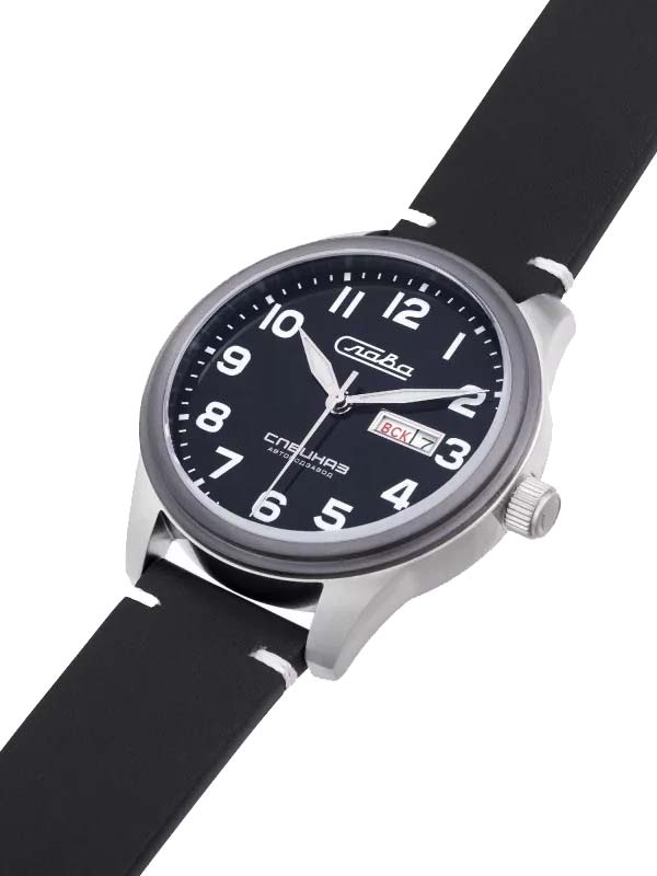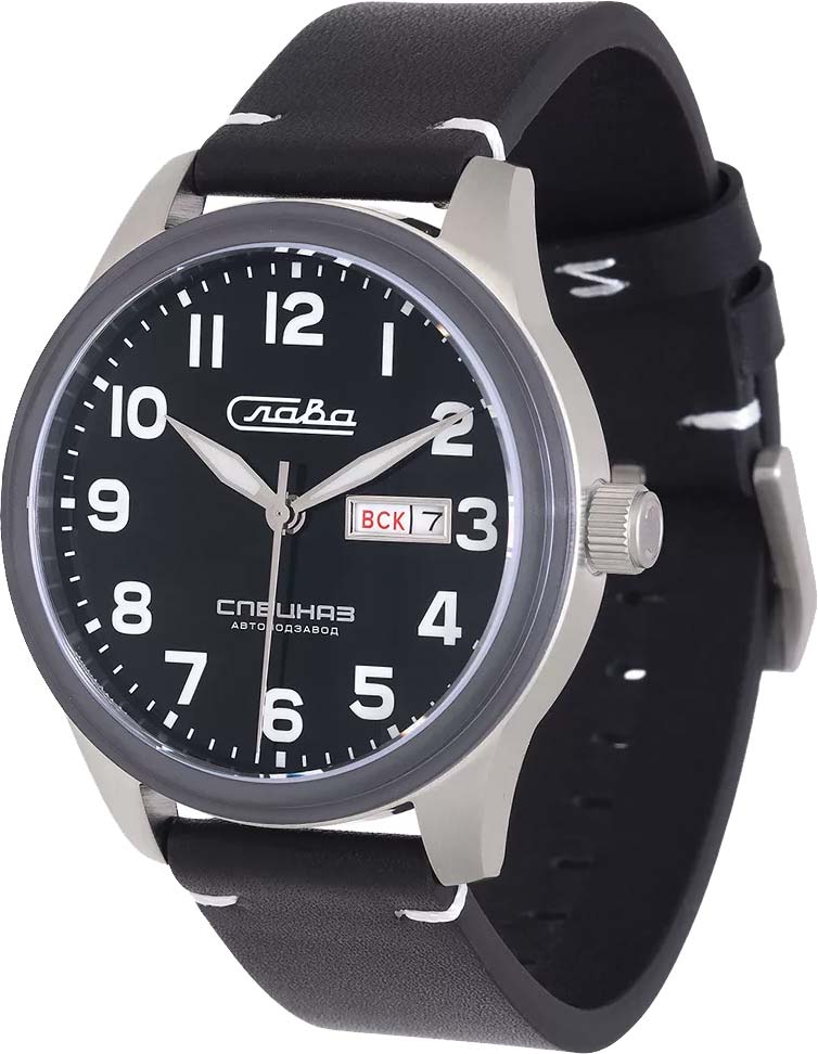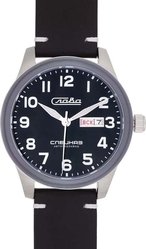Традиция. Мужские механические часы с автоподзаводом. В механизме 21 камень, частота 21600 полуколебаний в час. Запас хода 42 часа. Круглый стальной корпус. Окошко даты и дня недели в положении 3 часа. Метки в виде арабских цифр. Надпись «Спецназ» и логотип на циферблате. Рифленая заводная головка. Удобный ремешок из натуральной кожи с классической застежкой.