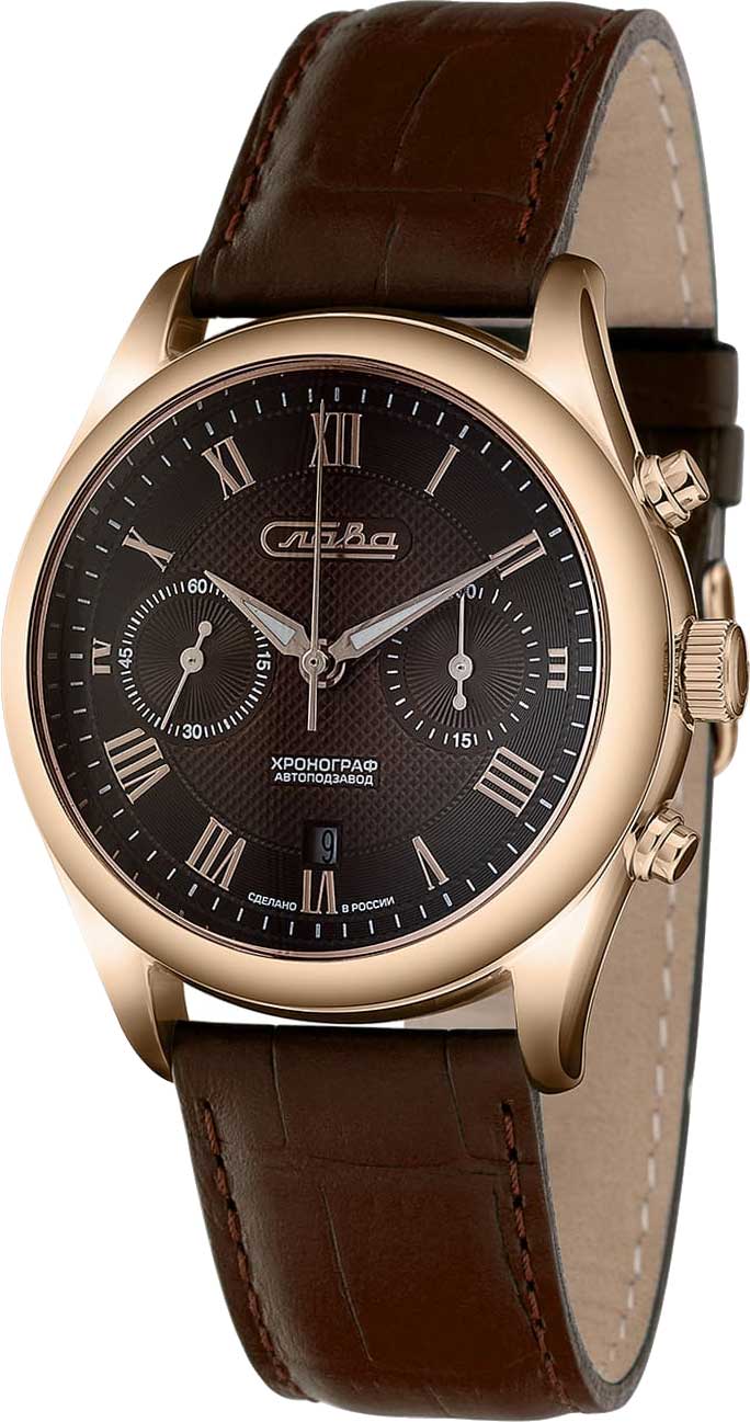 Механический хронограф с классическим круглым корпусом на ремешке из натуральной кожи - практичный выбор для смелых и решительных. Премьер. Мужские механические часы-хронограф с секундомером и автоподзаводом. В механизме 32 камня, частота 28800 полуколебаний в час. Запас хода 45 часов. Метки в виде римских цифр. Окошко даты в положении 6 часов. Рифленая заводная головка. Кожаный ремешок с классической застежкой.