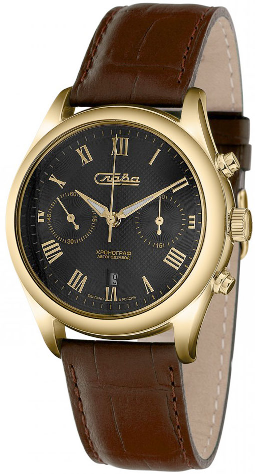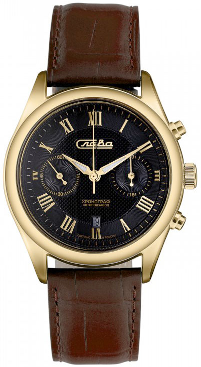 Механический хронограф с классическим круглым корпусом на ремешке из натуральной кожи - практичный выбор для смелых и решительных. Мужские механические часы-хронограф Премьер с секундомером и автоподзаводом. Циферблат украшен декоративными узорами и фирменным логотипом ''Слава''. Окошко даты в положении 6 часов. Стрелки с нанесенным люминесцентным составом, который светится в темноте. Рифленая заводная головка. Удобный кожаный ремешок с классической застежкой.
