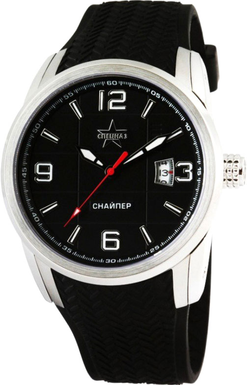Часы из коллекции «Снайпер» - настоящие мужские часы, которые делают время надежным спутником человека. Снайпер. Коллекционная серия - 200 шт. В механизме 21 камень, частота 21600 полуколебаний в час. Запас хода 42 часа. Окошко даты. Возможность ручного завода. Задняя крышка крепится на 4-х винтах. Полиуретановый ремешок с тройной раскладывающейся застежкой.