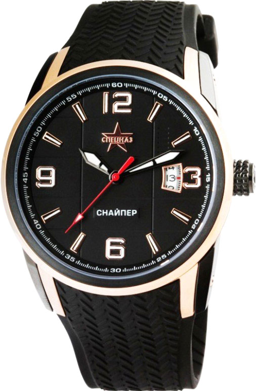 Часы из коллекции «Снайпер» - настоящие мужские часы, которые делают время надежным спутником человека. Снайпер. Коллекционная серия - 200 шт. В механизме 21 камень, частота 21600 полуколебаний в час. Запас хода 42 часа. Окошко даты. Возможность ручного завода. Прозрачная задняя крышка крепится на 4-х винтах. Полиуретановый ремешок с тройной раскладывающейся застежкой.