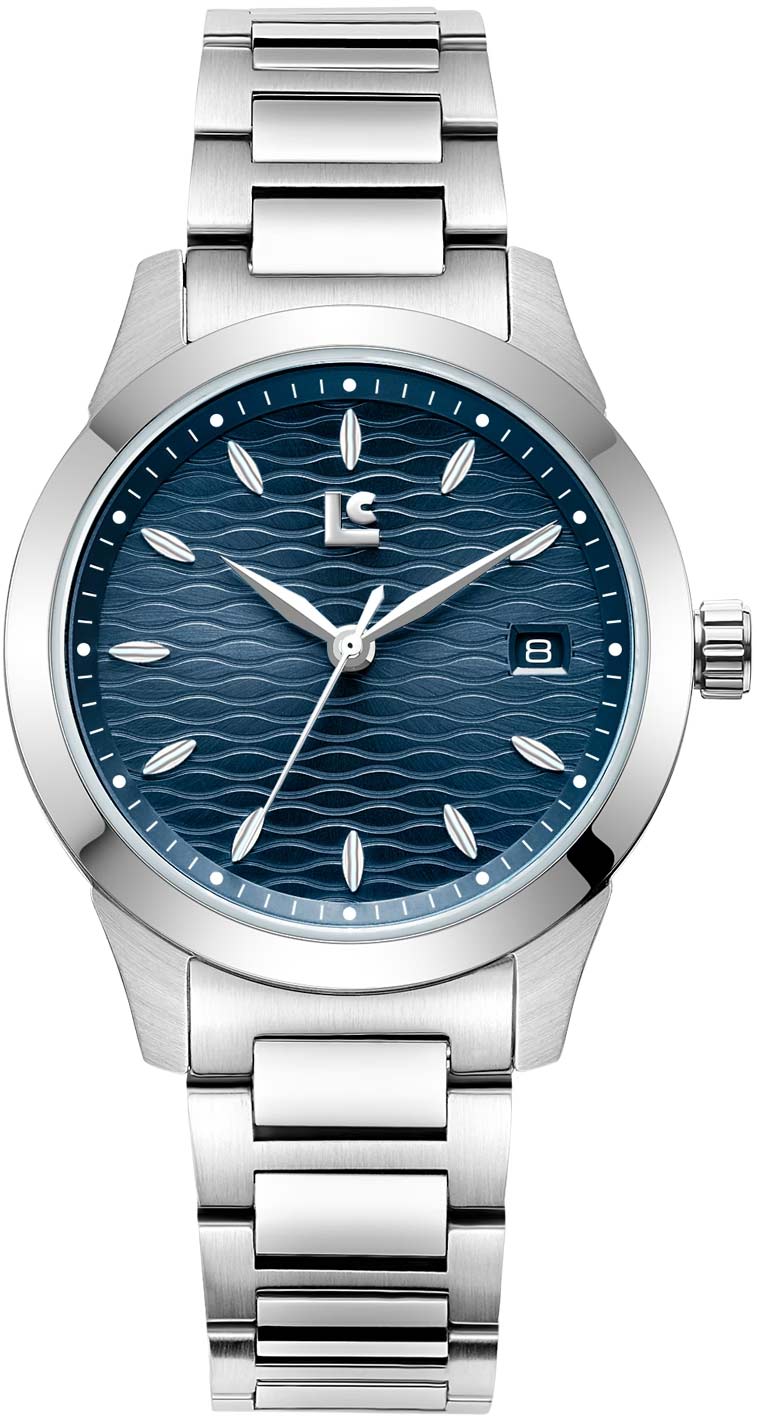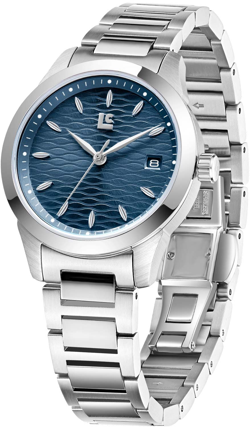 Женские наручные часы. Круглый стальной корпус с сатинированной поверхностью и глянцевым безелем. Циферблат выполнен по технологии Sunray (солнечные лучи) и украшен волнообразным рисунком. Метки в виде штрихов с люминесцентным покрытием, которое светится в темноте после непродолжительной зарядки на свету.