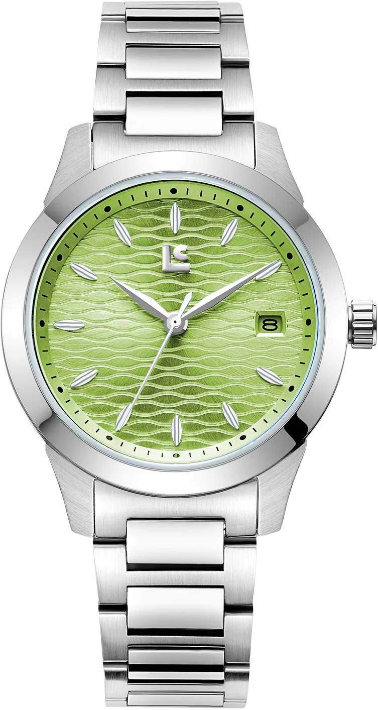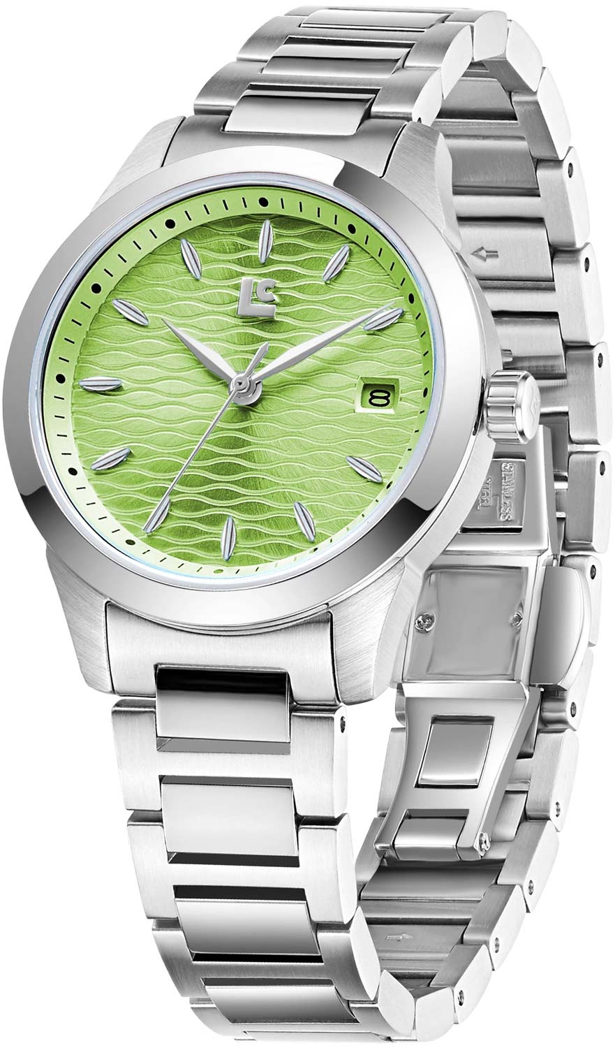 Женские наручные часы. Круглый стальной корпус с сатинированной поверхностью и глянцевым безелем. Циферблат выполнен по технологии Sunray (солнечные лучи) и украшен волнообразным рисунком. Метки в виде штрихов с люминесцентным покрытием, которое светится в темноте после непродолжительной зарядки на свету.