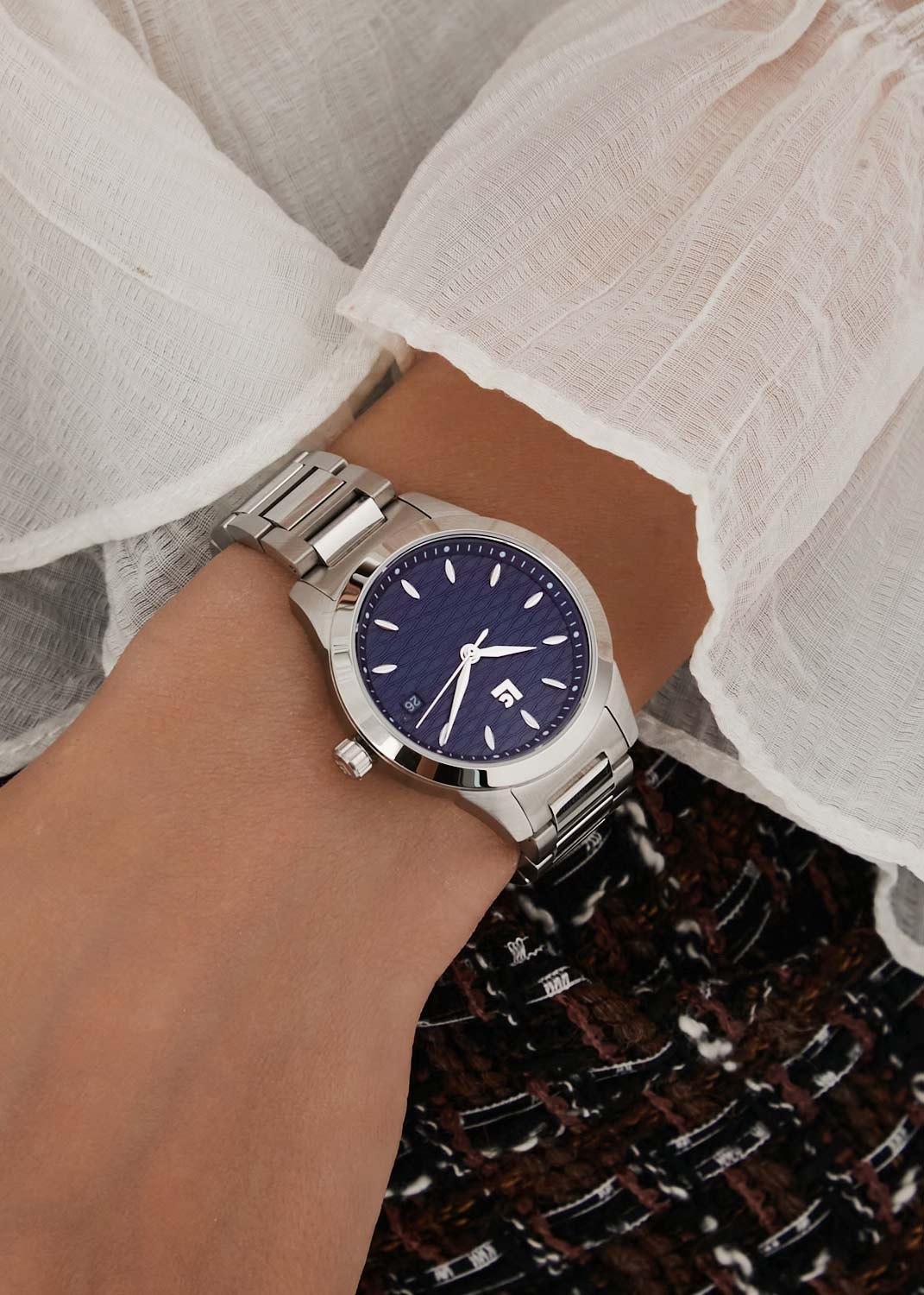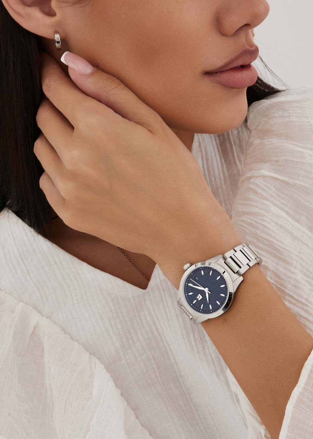 Окошко даты находится в положении 3 часа. Рифленая заводная головка. Завинчивающаяся задняя крышка. Браслет с раскладывающейся застежкой.