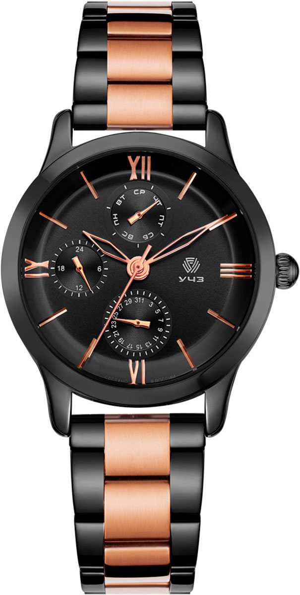 Женские наручные часы. 12-ти и 24-х часовой формат времени. Время в 24-х часовом формате, дата и день недели вынесены на отдельные циферблаты. Циферблат выполнен по технологии Sunray (солнечные лучи). Метки в виде римских цифр и штрихов. Браслет с раскладывающейся застежкой.