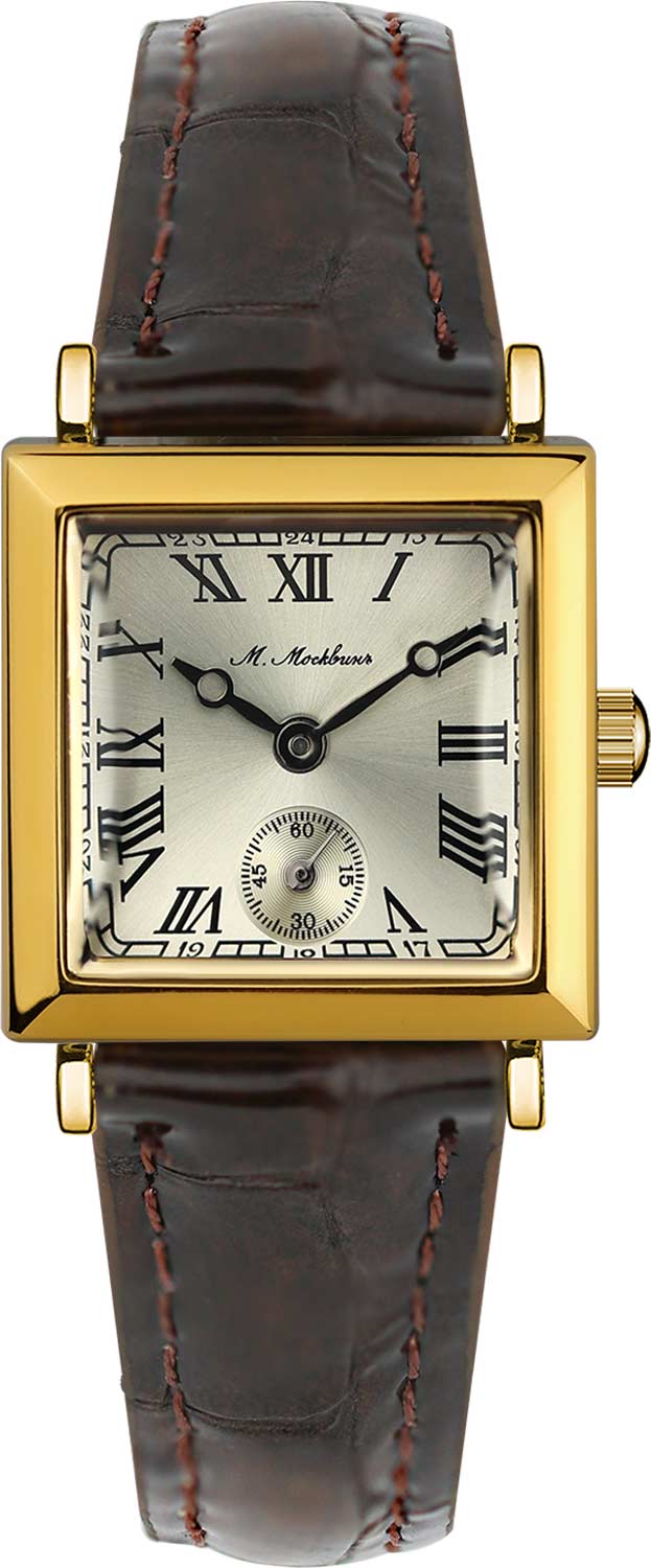 Женские наручные часы. Квадратный корпус из латуни. Циферблат выполнен по технологии Sunray (солнечные лучи) и защищен минеральным стеклом. Метки в виде римских цифр.